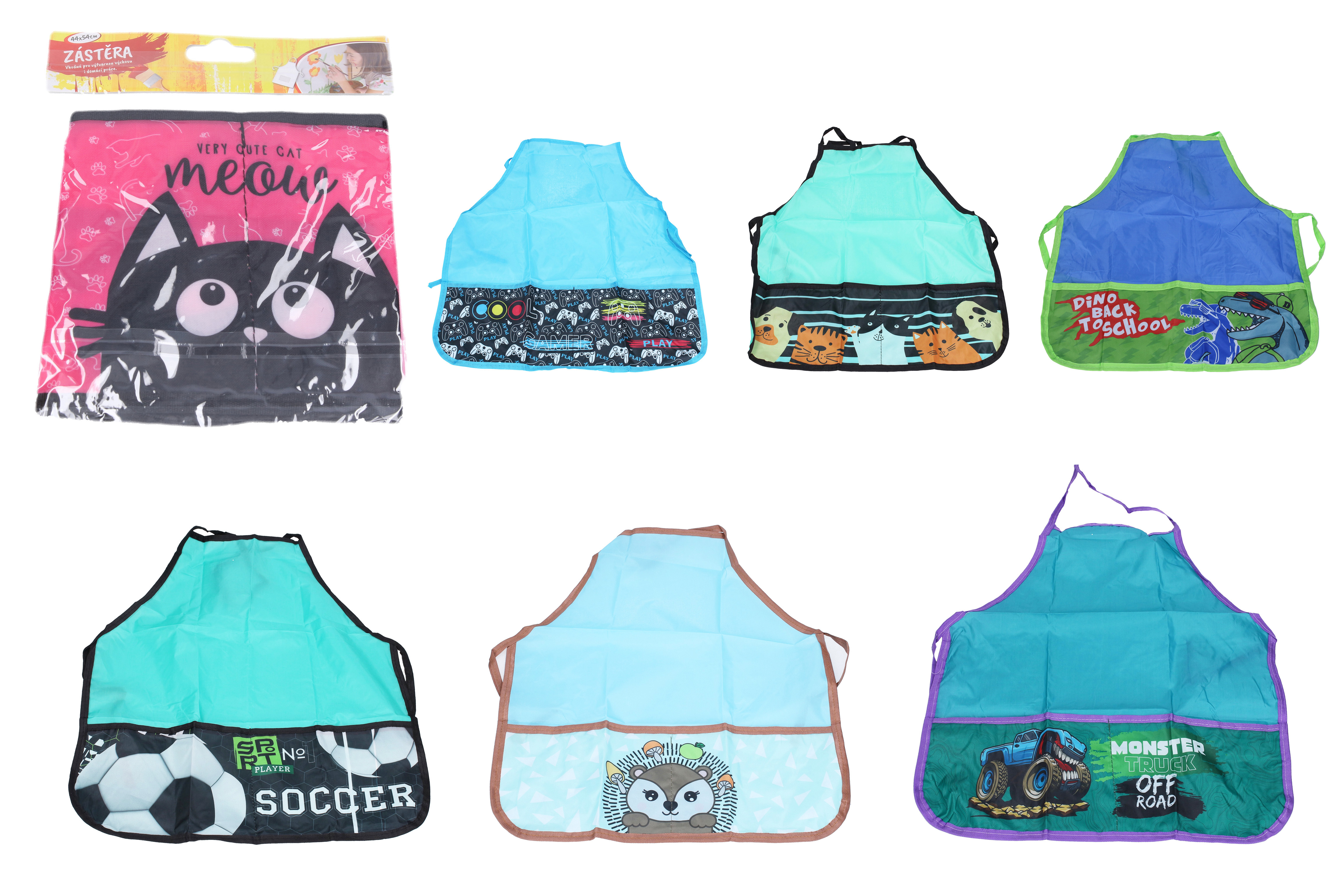 Zástěra na výtvarnou výchovu o velikosti 54x44 cm mix. 7 různých motivů: fotbal, kočka, gamer, monster truck, dino, ježek, pes + kočka.