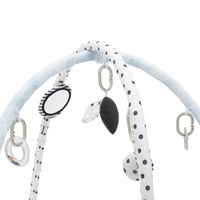 Hermosa alfombra de juego educativa con arco de actividades que desarrolla la imaginación del bebé a través del reconocimiento de colores y formas. La suave alfombra con un diseño ingenioso es ligera y fácil de transportar. Juguetes colgantes: sonajero, silbato. La diadema es desmontable, al igual que los juguetes. Su material agradable y suave permite que el bebé esté cómodo boca abajo o boca arriba y le permite moverse libremente. La alfombra está impresa con lunas, para que los padres puedan capturar esos momentos efímeros mientras su bebé crece. La alfombra educativa proporciona un espacio seguro y agradable, convirtiéndose en el lugar favorito para jugar de su bebé. Dimensiones: diámetro: aproximadamente 89 cm, altura aproximadamente 58 cm. Adecuado para bebés a partir de 3 meses.