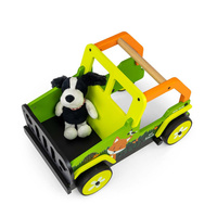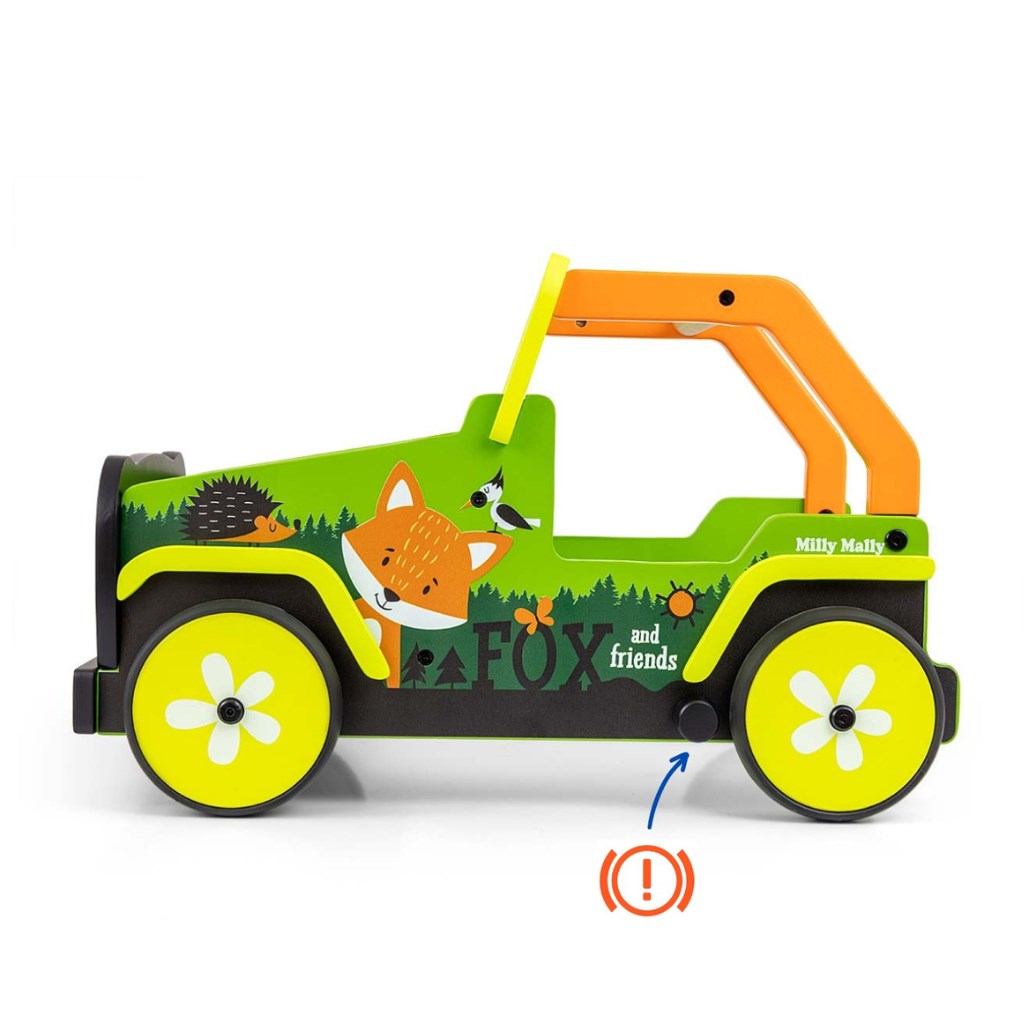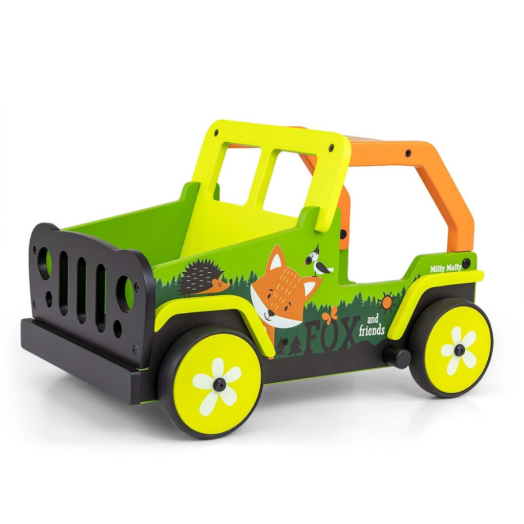 Este andador infantil, inspirado en los legendarios vehículos todoterreno, está fabricado con madera de alta calidad y materiales ecológicos. Las cubiertas de las ruedas están hechas de un plástico TPR suave, flexible y duradero que permite su uso en todas las superficies sin dañar ni rayar. No contienen plastificantes y son respetuosos con el medio ambiente.