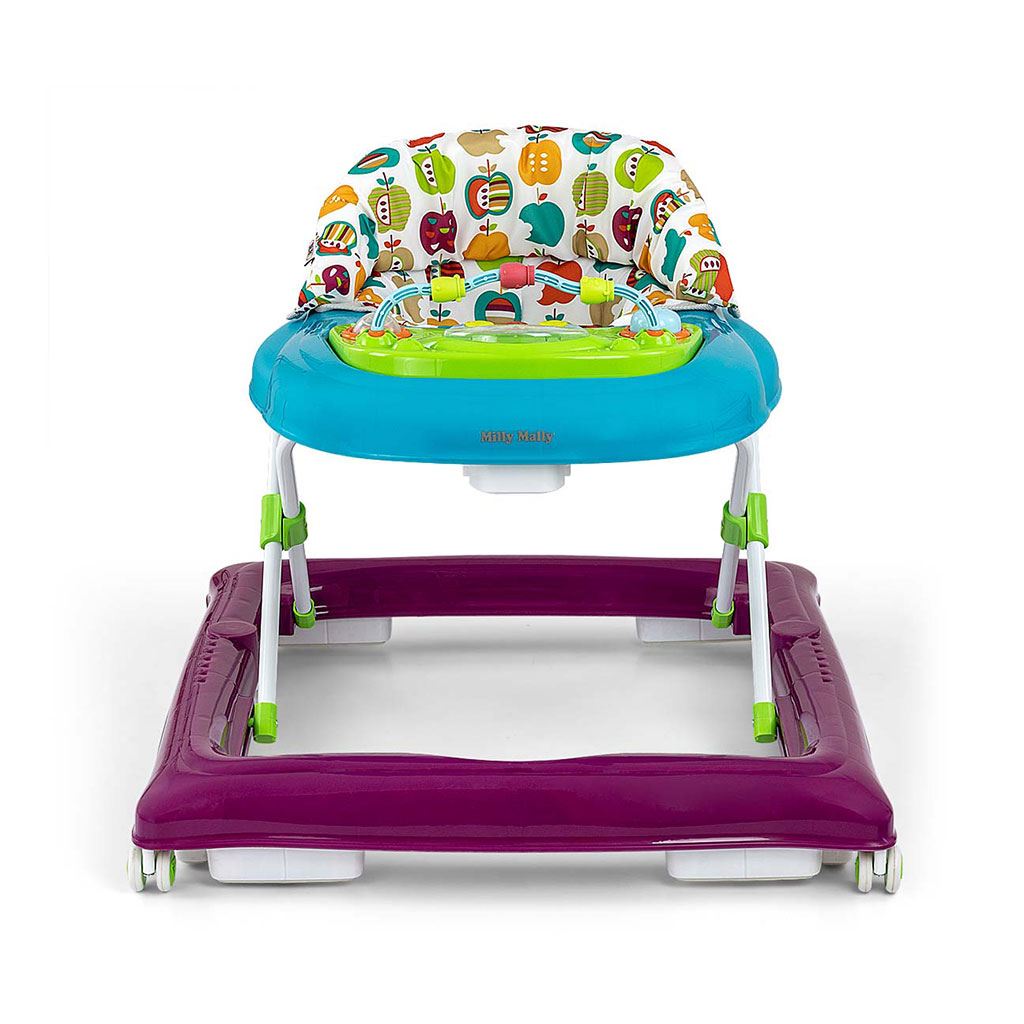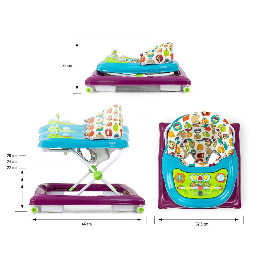 El producto cuenta con un panel educativo que incluye una variedad de sorpresas para los pequeños exploradores: luces, pitidos, melodías, sonajeros, botones y otros elementos móviles. Al quitar el panel de la bandeja del andador, se convierte en un juguete independiente, por ejemplo, como compañero de viaje, y la placa puede usarse como mesa de juegos.