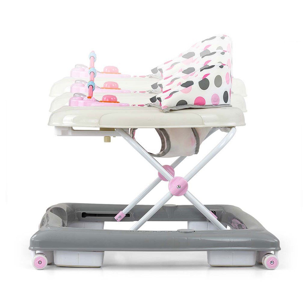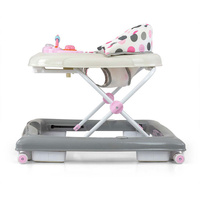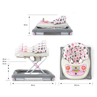 El producto cuenta con un panel educativo que incluye una variedad de sorpresas para los pequeños exploradores: luces, pitidos, melodías, sonajeros, botones y otros elementos móviles. Al quitar el panel de la bandeja del andador, se convierte en un juguete independiente, por ejemplo, como compañero de viaje, y la placa puede usarse como mesa de juegos.