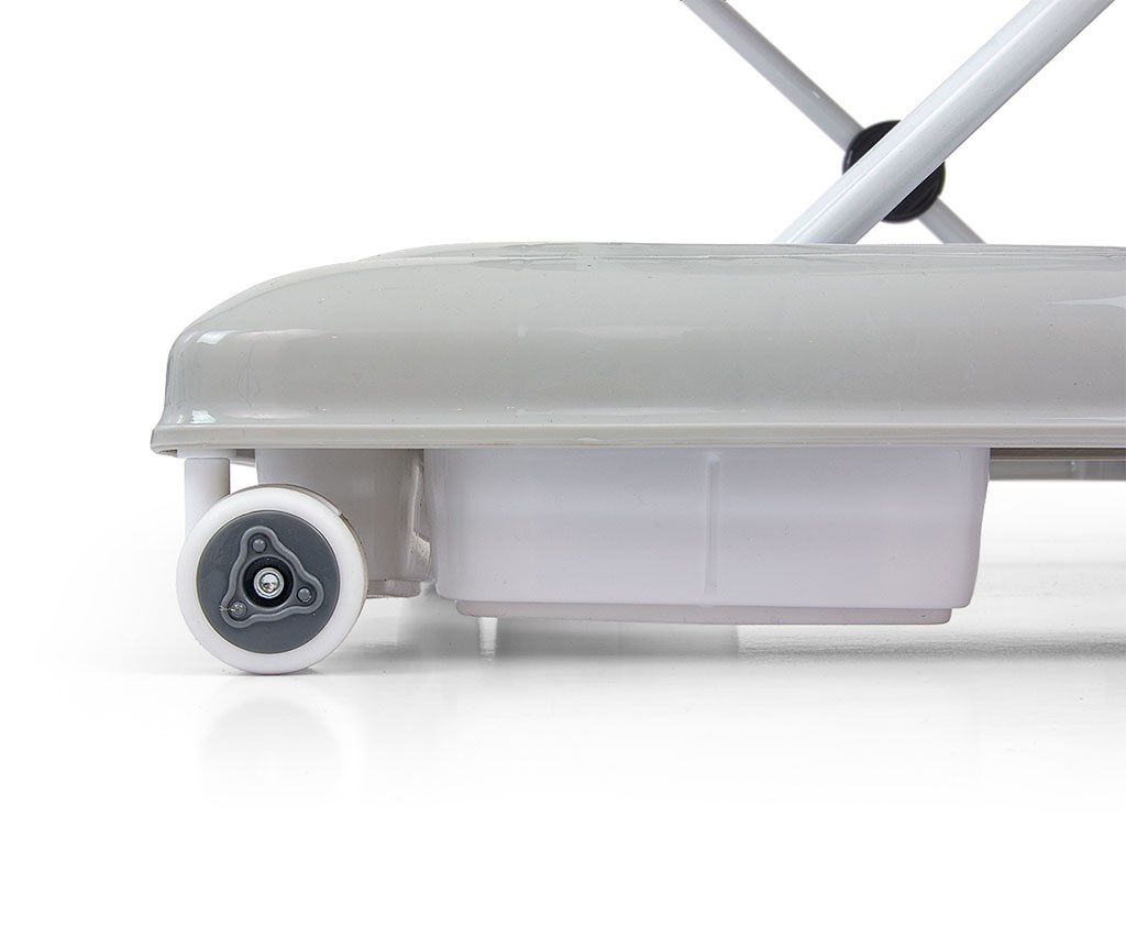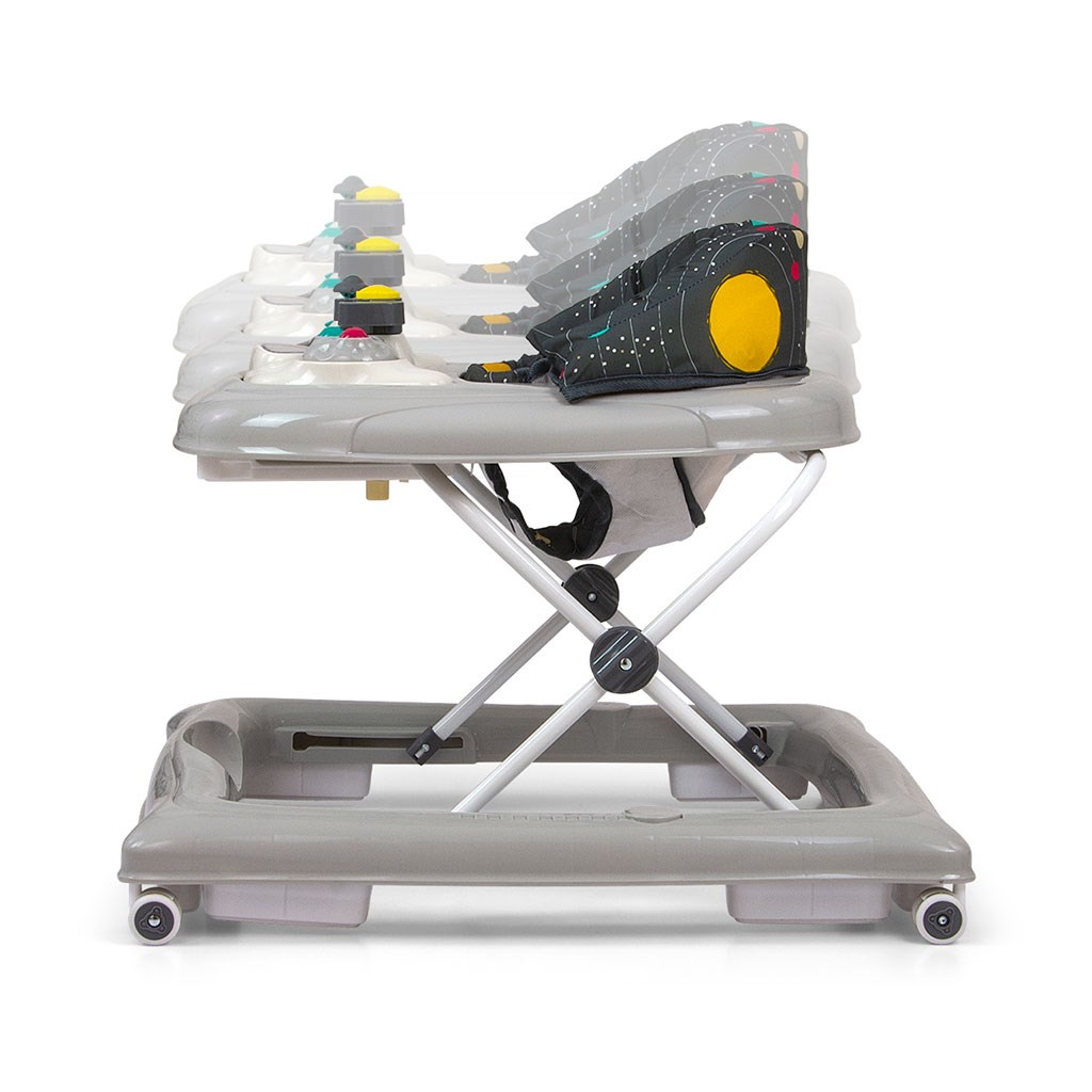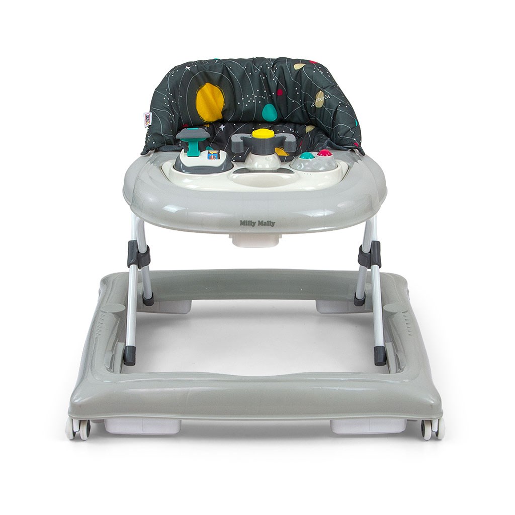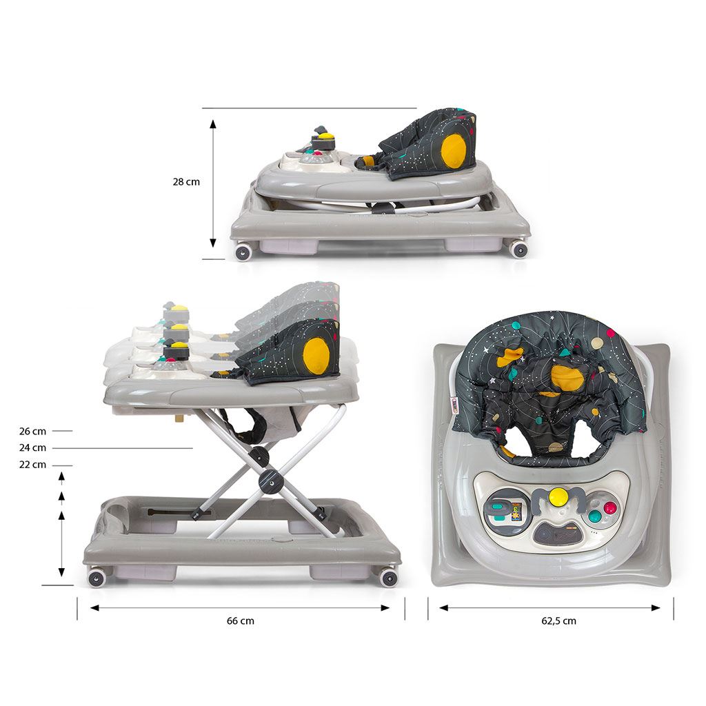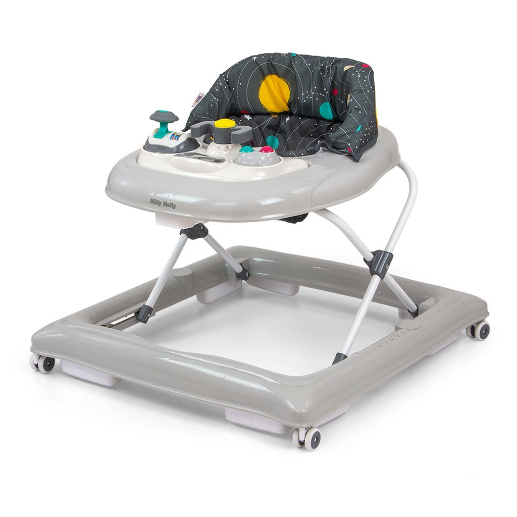 El producto cuenta con un panel educativo que incluye una variedad de sorpresas para los pequeños exploradores: luces, pitidos, melodías, sonajeros, botones y otros elementos móviles. Al quitar el panel de la bandeja del andador, se convierte en un juguete independiente, por ejemplo, como compañero de viaje, y la placa puede usarse como mesa de juegos.