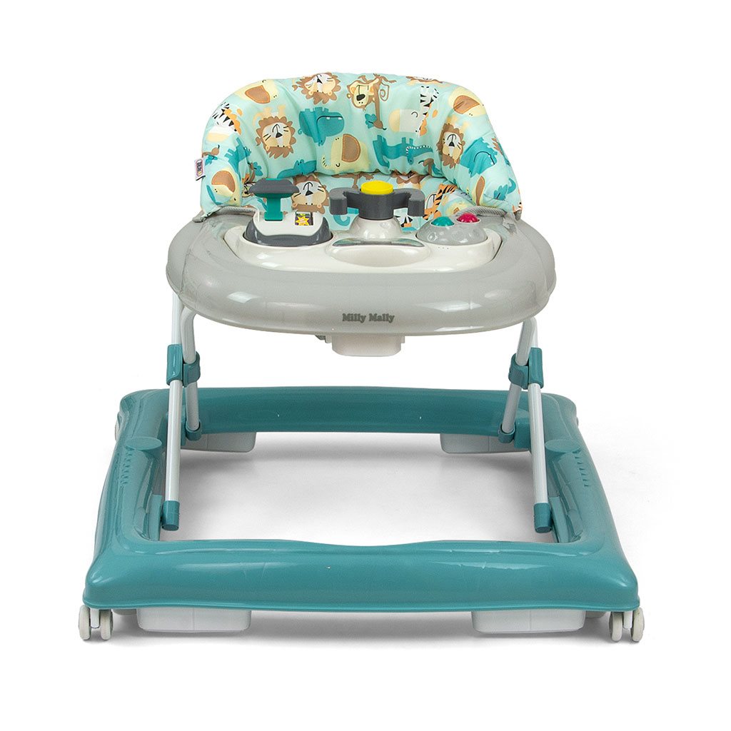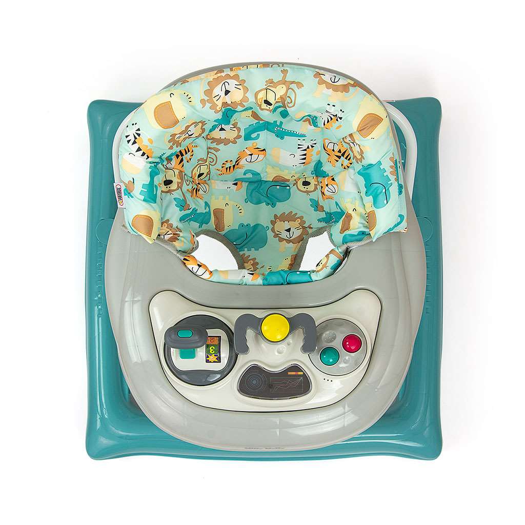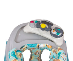 El producto cuenta con un panel educativo que incluye una variedad de sorpresas para los pequeños exploradores: luces, pitidos, melodías, sonajeros, botones y otros elementos móviles. Al quitar el panel de la bandeja del andador, se convierte en un juguete independiente, por ejemplo, como compañero de viaje, y la placa puede usarse como mesa de juegos.