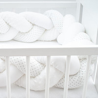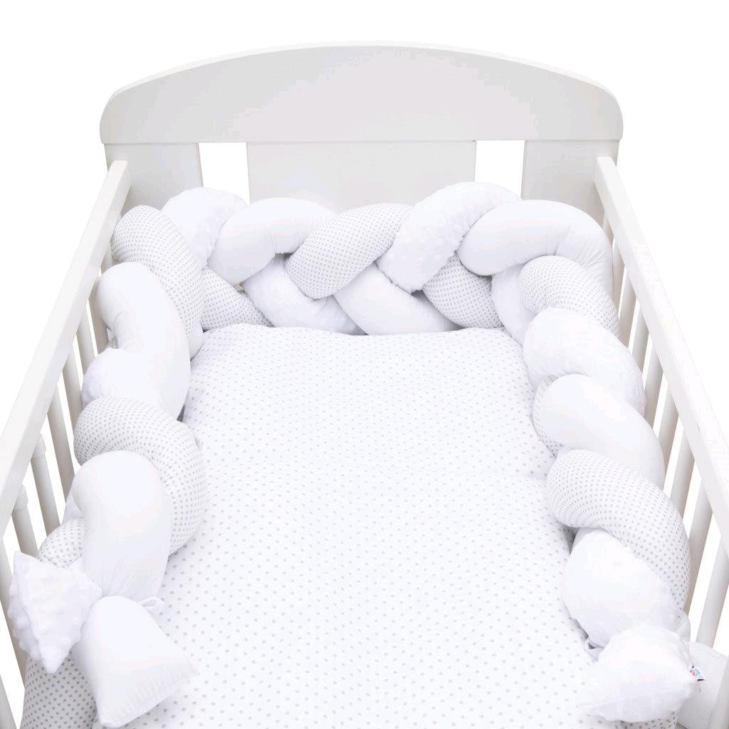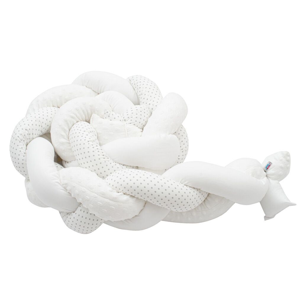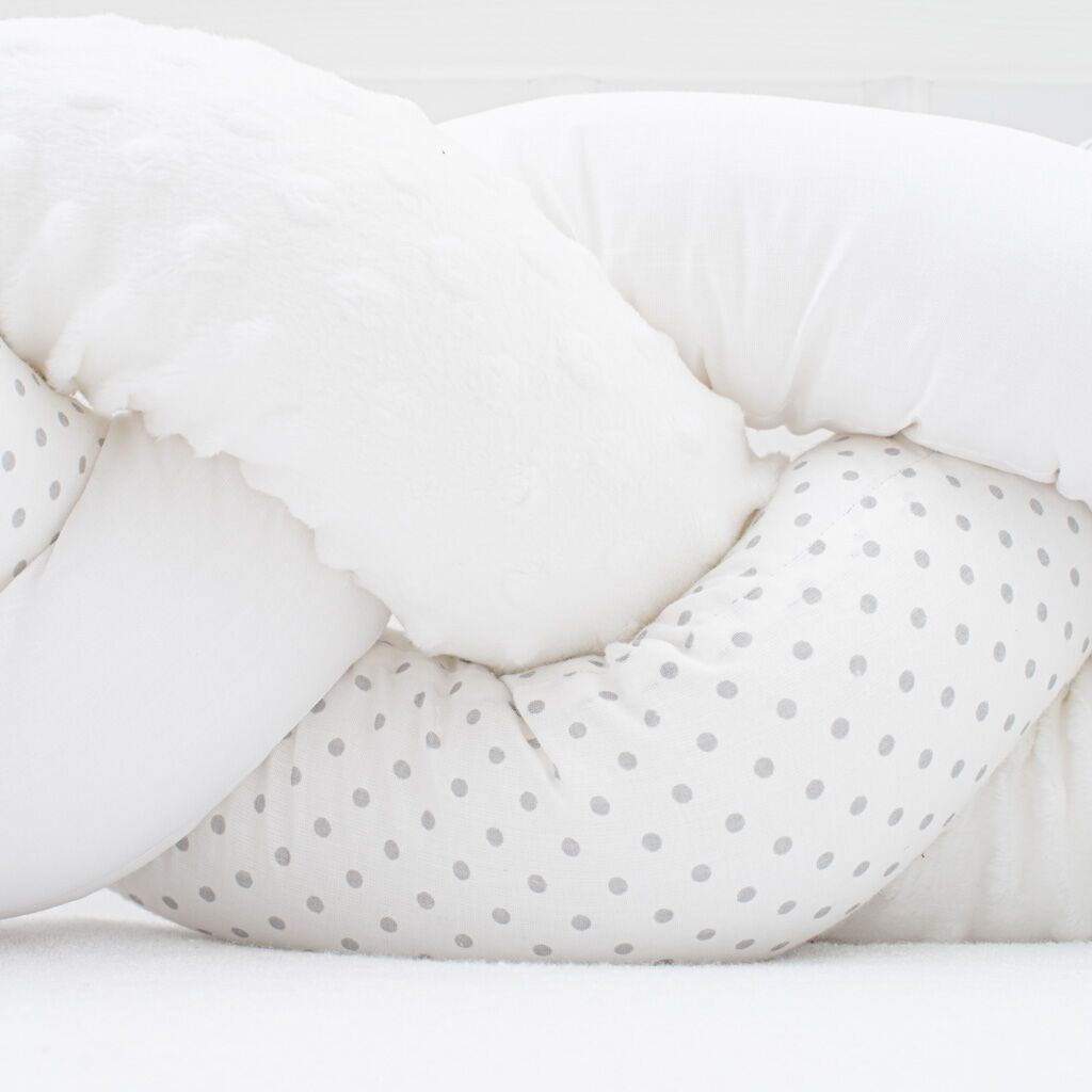 Suave y práctico, el trenzado de la marca checa New Baby es una alternativa moderna al protector tradicional o de almohada, no solo para la cuna del bebé. Todos los tres hilos están hechos de un material de algodón de alta calidad, minky y relleno de poliéster antialérgico, trenzados a mano. Puede utilizarse en la cuna o en el moisés, protegiendo al bebé de los duros barrotes y aislándolo de las frías paredes. En su cama, cumple la función de nido, permitiendo que el bebé sea envuelto para una mayor sensación de seguridad y comodidad. El protector se adapta a cualquier cuna y, utilizando las tres cintas proporcionadas, se puede sujetar fácilmente. Un niño mayor puede usarlo para jugar o como decoración original en la habitación infantil.