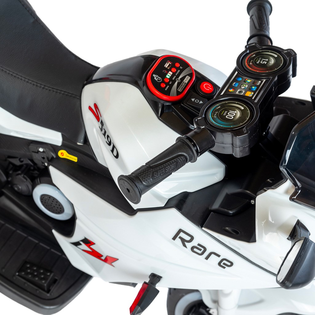 La moto eléctrica infantil Rare Baby Mix está equipada con una batería de 6V7AH y dos motores con una potencia de 380. Dispone de una función de inicio sencillo con un solo botón, que permite avanzar y retroceder. La moto cuenta con música, canciones para niños, una tarjeta para leer datos para la educación temprana, tres ruedas y faros LED. La comodidad está asegurada por su asiento de cuero.