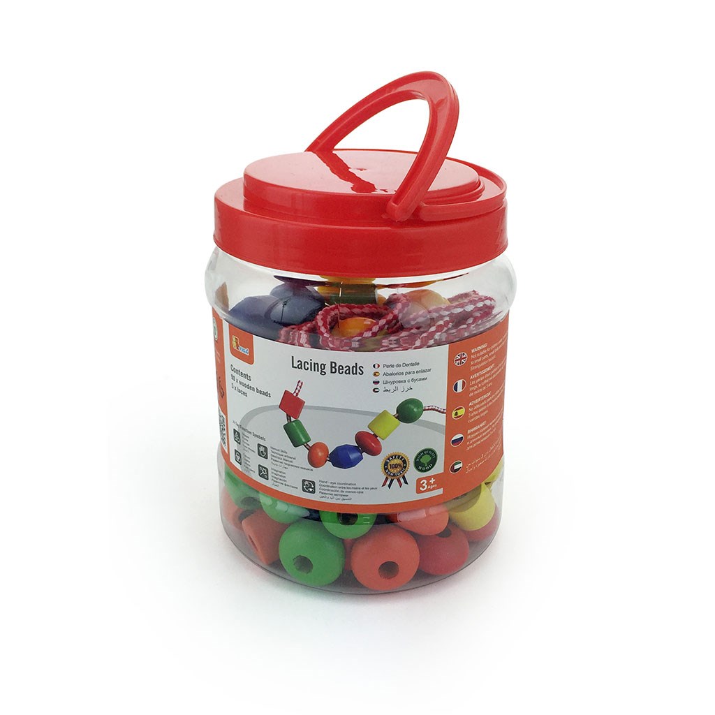 El paquete contiene 90 piezas de cuentas de colores en varias formas y 5 cordones para ensartar. Al deslizar las cuentas de madera por el cordón, los niños pueden crear patrones infinitos y combinar diferentes formas y colores.