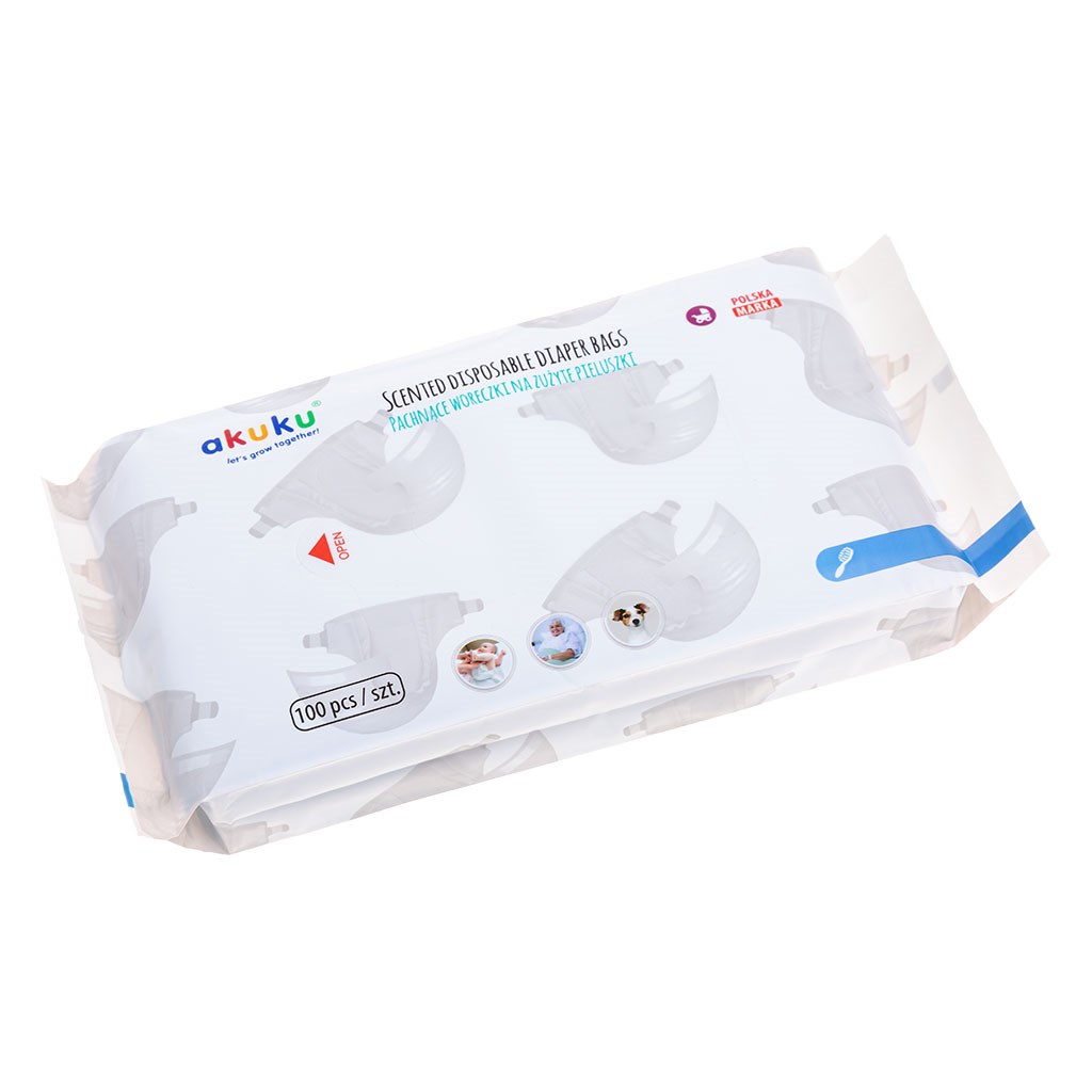 Juego de bolsas desechables perfumadas que garantizan de forma higiénica la eliminación de pañales usados, pañuelos o toallitas. Este práctico accesorio no debería faltar en ningún cambiador, bolsa o carrito durante los paseos. Son lo suficientemente grandes para todas las dimensiones de pañales. El paquete cuenta con un cierre sencillo y contiene 100 bolsas.