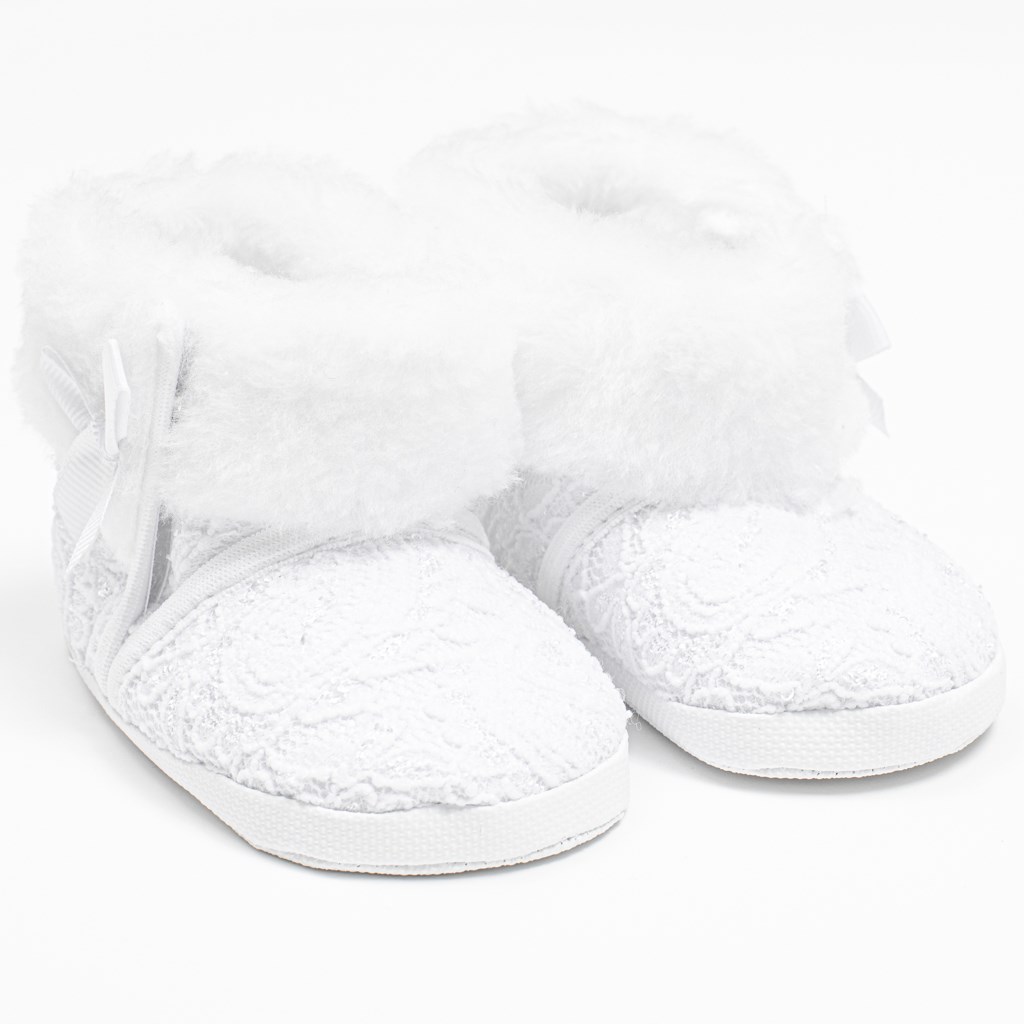 Zapatillas de invierno para bebés New Baby. Bonitas y cálidas botas con encaje y cierre de velcro. La parte interior está forrada con tejido de lana - 100% poliéster. Las zapatillas se ajustan al pie y tienen un amplio interior que permite el libre movimiento de los dedos y los músculos. Este producto no está diseñado para caminar. Son muy ligeras con una suela sintética delgada. Composición: 100% poliéster, tejido de lana - 100% poliéster. Suela: material sintético PVC sin BPA. La longitud de la plantilla interior es de 10 cm. Diseñadas para bebés de 0 a 3 meses. Se entregan en una práctica caja. Advertencia: bajo la plantilla textil, a veces se encuentra una plantilla de papel que mantiene la forma de la zapatilla. Retire esta plantilla de papel antes del primer uso.