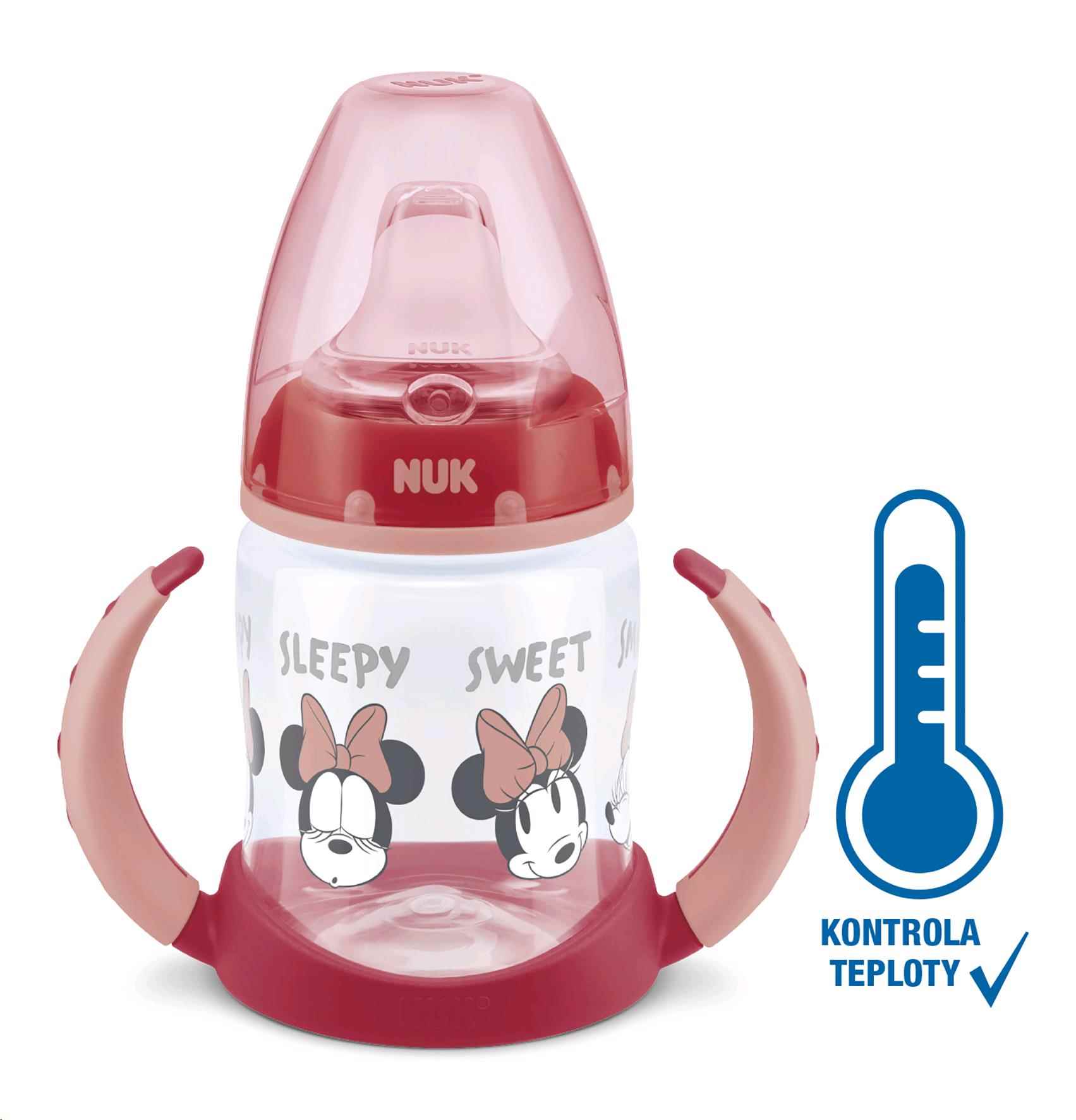 Botella de aprendizaje NUK First Choice con control de temperatura. El indicador de control de temperatura incorporado cambia de color si el contenido de la botella está demasiado caliente. El color azul del indicador se transforma en blanco. La botella facilita a los bebés la transición de la lactancia o la alimentación a beber por sí mismos. La botella cuenta con una suave boquilla de silicona a prueba de derrames, por lo que no tendrás que preocuparte por derrames. Tiene un diseño ergonómico y asas antideslizantes, permitiendo que el niño pueda sostener la botella por sí mismo, incluso mientras va en el cochecito. Una ventaja de esta botella es que se desmonta y limpia fácilmente. Fabricada con plástico de alta calidad, polipropileno, y libre de BPA (Bisfenol A). Adecuada para niños de 6 a 18 meses. Clínicamente probado. El paquete incluye: