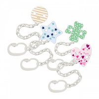 Encadenamiento divertido y colorido para chupetes NUK, es una herramienta fantástica para bebés y padres. Indispensable especialmente durante los viajes y paseos. Gracias a su clip, el chupete no caerá al suelo, no se ensuciará ni se perderá. Tiene un uso sencillo y está diseñado para poder sujetarse a la ropa del bebé. Sus colores vibrantes y alegres imágenes captarán la atención del niño. Apto para bebés desde sus primeros días de vida. Compatible con chupetes con anillo.