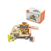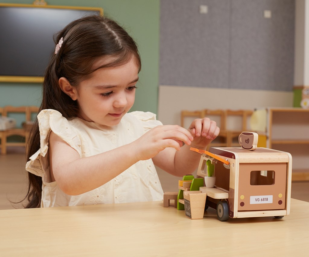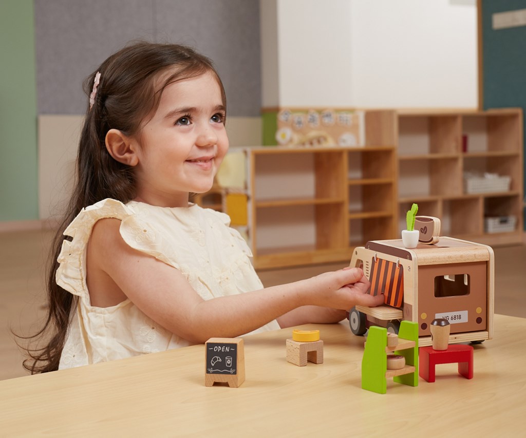 Caravana de madera, terminada en colores amigables, es una excelente herramienta para el desarrollo de la imaginación y las habilidades sociales durante el juego de roles.