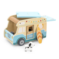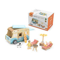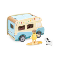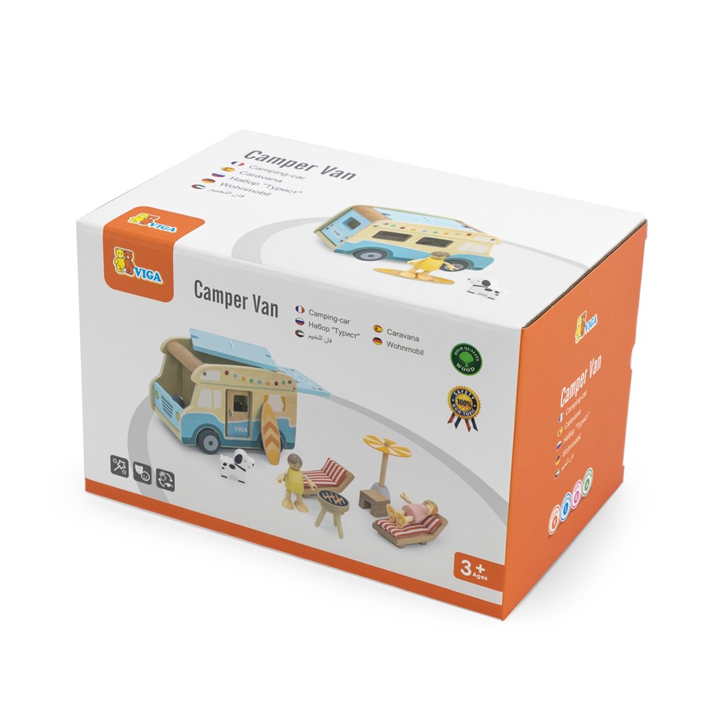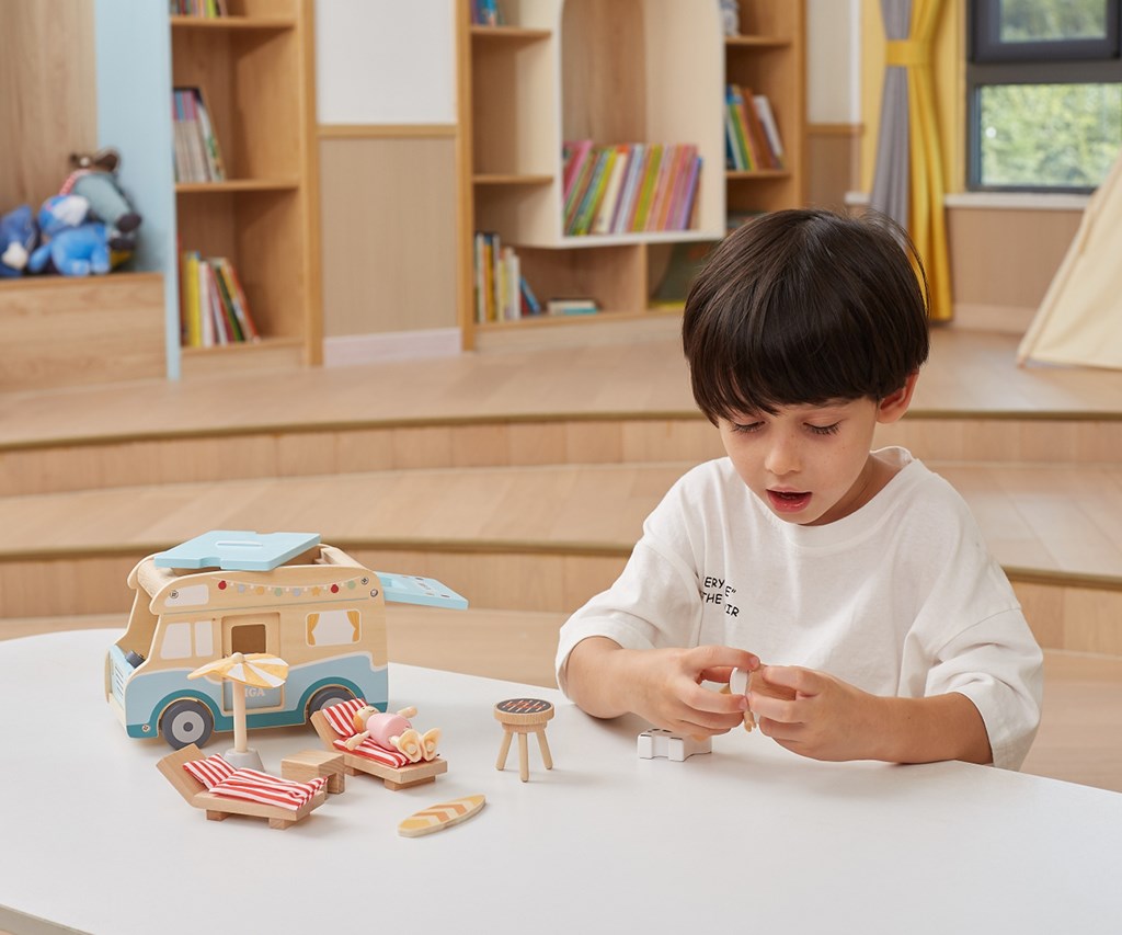 La caravana de madera es un juguete excepcional que lleva a los niños a un mundo de aventuras vacacionales y viajes veraniegos. El conjunto está inspirado en escapadas despreocupadas a la playa y, gracias a sus detalles precisos y funciones realistas — como las puertas deslizantes, el techo retráctil o el portaequipajes para la tabla de surf — proporciona horas de diversión creativa. La caravana incluye una rica variedad de accesorios: dos muñecas, un perro, tumbonas con cojines, una sombrilla, una parrilla e incluso una tabla de surf, lo que permite a los niños jugar todo tipo de escenarios. Así, pueden representar roles relacionados con viajes, relax en la playa o la organización de un picnic.