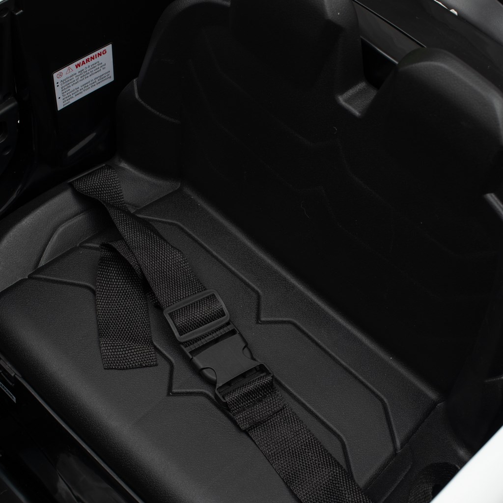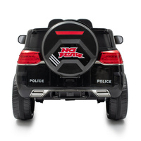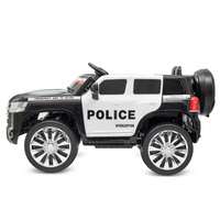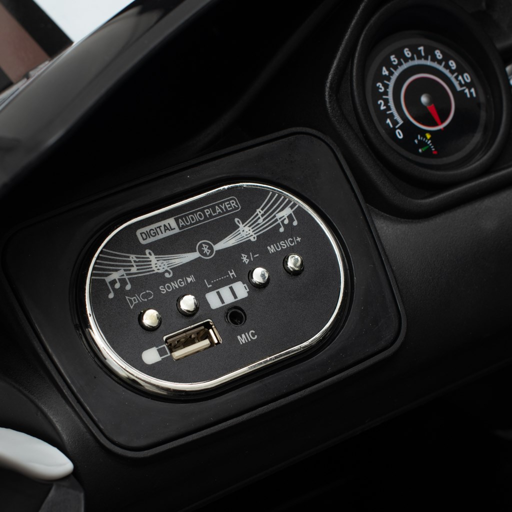 Coche eléctrico para niños Baby Mix Police con tracción 4x4 y batería de 12V 7Ah, que maneja fácilmente terrenos difíciles y subidas. El coche está equipado con un control remoto para padres, que permite conducir hacia adelante, hacia atrás, a la izquierda y a la derecha. También cuenta con un panel musical que tiene melodías y canciones pregrabadas y permite la conexión USB. En el tablero a la derecha se encuentra una imitación de pantalla LCD y botones para conducir y el botón de arranque.