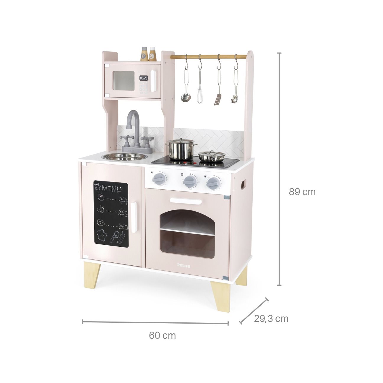 Cada cocinita cuenta con fregadero, horno y hornilla, donde pueden preparar sus platos favoritos para toda la familia. Además, pueden escribir sus recetas preferidas con tiza en la pizarra de la parte frontal de la cocinita. Coloca una olla sobre la hornilla, cuyos fogones se iluminarán, y prepara cualquier comida para las muñecas y ositos. La cocina viene equipada con los utensilios necesarios para cocinar.