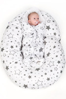 Cojín de lactancia universal New Baby en forma de letra C es ideal para la colocación cómoda del bebé durante la lactancia. Protege la columna vertebral de la madre contra la sobrecarga, previene el dolor de espalda y al mismo tiempo proporciona comodidad al bebé. La funda es desmontable. Material: superficie – 100% algodón, relleno – 100% poliéster. Longitud alrededor de 285 cm, diámetro aproximadamente 16 cm, circunferencia aproximadamente 60 cm. Muchas formas de uso: