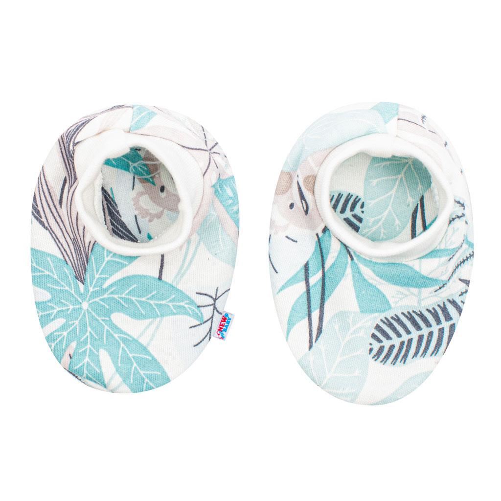 Hermoso y práctico conjunto de algodón de la marca checa New Baby Lovely. El conjunto consiste en zapatitos y manoplas. Los zapatitos y las manoplas están decorados con un patrón encantador y cuentan con puños ajustables. Composición: 100% algodón.