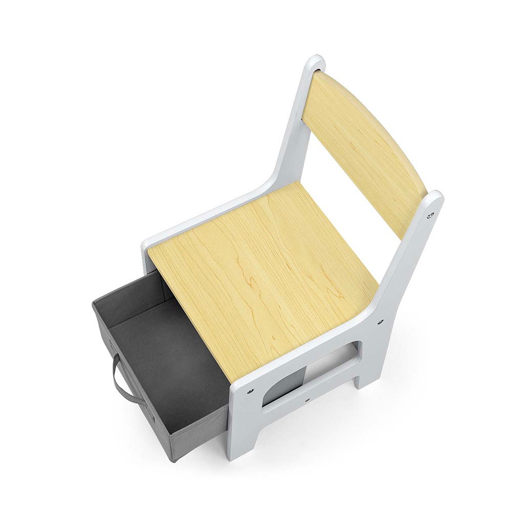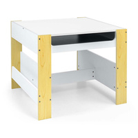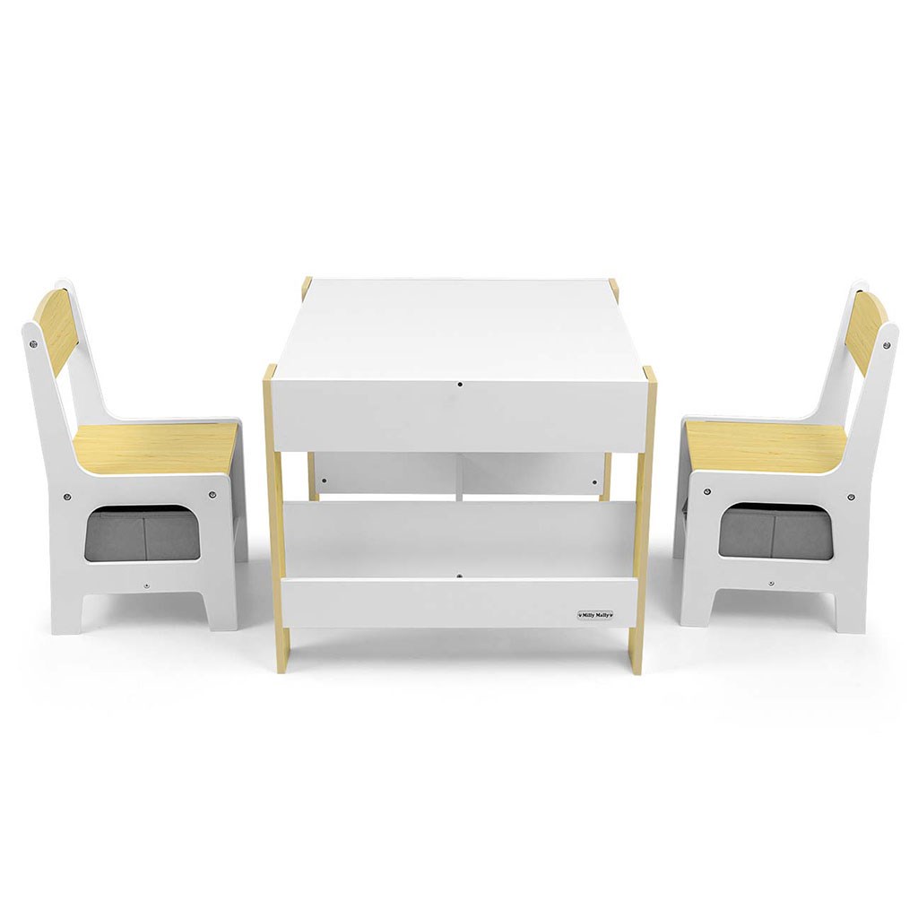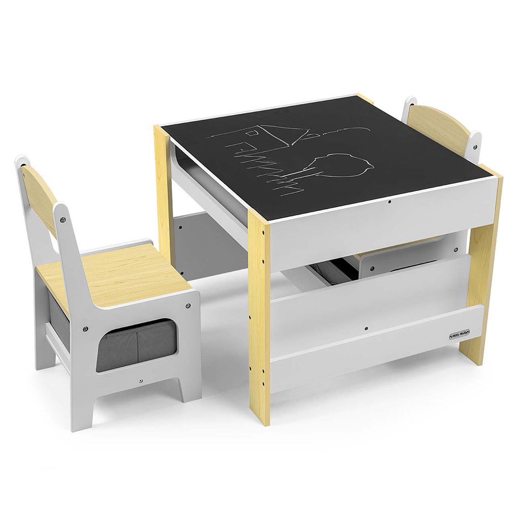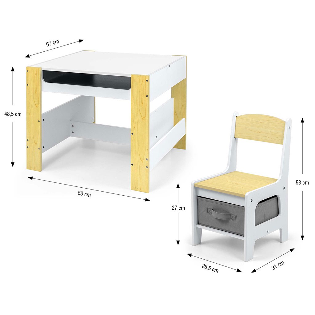 Juego de muebles multifuncional para niños. La mesa SVEN con 2 sillas en color blanco y gris, con detalles en gris, ha sido diseñada para ofrecer a los niños: comodidad, espacio para juegos creativos, pintura, escritura y el máximo confort en sus actividades. El conjunto incluye 2 sillas con 2 organizadores de tela almacenados en el estante debajo de las sillas. La mesa está equipada con un gran espacio de almacenamiento ubicado debajo de una tabla extraíble y reversible. También cuenta con estantes de almacenamiento laterales. En un lado de la mesa hay una gran pizarra para dibujar. Las sillas son ligeras y los niños pueden moverlas libremente. El mobiliario está fabricado con precisión y meticulosidad excepcionales. Ambas sillas tienen bordes redondeados, que protegen al niño de posibles lesiones. Todos los elementos de la estructura de la mesa y las sillas garantizan alta estabilidad y minimizan el riesgo de caídas. El conjunto Sven, fabricado en MDF, es duradero y fácil de mantener. El juego de muebles es fácil de ensamblar y todas las piezas necesarias para la instalación están incluidas en el paquete.