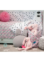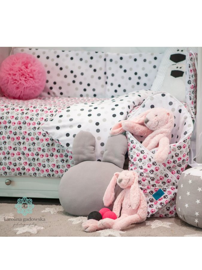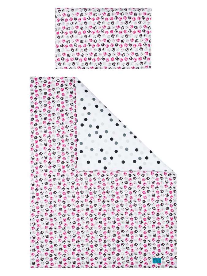 Conjunto de cuna de 5 piezas Belisima Gatitos para bebés, confeccionado en algodón. Un lado está completamente estampado con lunares y el otro lado presenta dibujos de gatitos. Está fabricado con un material suave y agradable al tacto. El conjunto incluye funda de almohada de aproximadamente 40x60 cm, funda de edredón de aproximadamente 100x135 cm, protector de cuna de aproximadamente 180 cm, y relleno para la almohada y el edredón. Material 100% algodón.