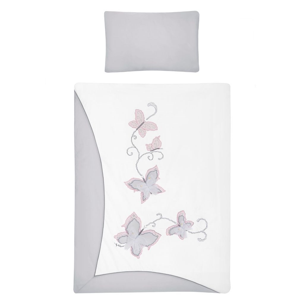 Bonita colección de cuna de algodón de 5 piezas Belisima Butterfly para bebés. Está fabricada con material suave y agradable. La colección incluye funda de almohada de aproximadamente 40x60 cm, funda de edredón de aproximadamente 100x135 cm, protector de cuna de aproximadamente 180 cm, relleno para la almohada y el edredón. Material 100% algodón.