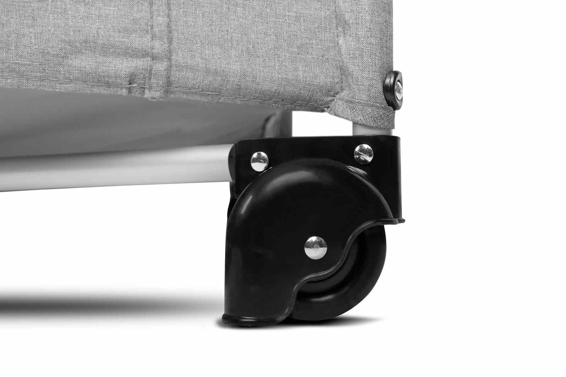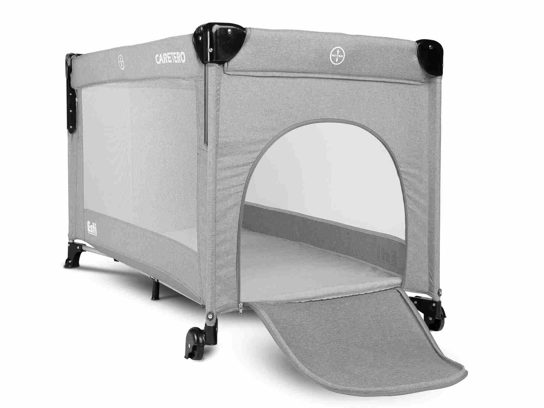 La cuna Esti es una cuna de viaje diseñada para facilitar el cuidado de los bebés. Su mayor ventaja es el costado reducido, que transforma la cuna en una cama adicional y garantiza un acceso más cómodo al niño. El práctico mecanismo de plegado significa que montarla o desmontarla solo toma un instante. La cuna también cuenta con ruedas con freno para un fácil desplazamiento. Las puertas laterales con cierre de cremallera permiten la entrada segura de los niños mayores, y la cuna se puede utilizar como parque.
