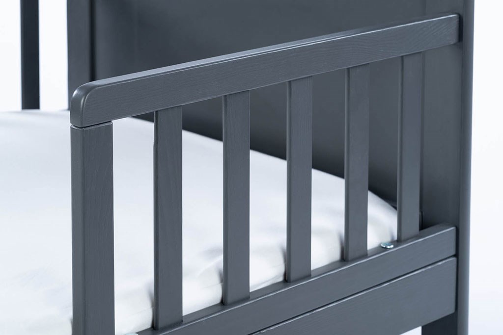 La calidad del mobiliario está garantizada por el uso de elementos de pino seleccionados sin defectos. La cuna ha sido pintada con un barniz a base de agua, que es seguro para la salud del niño y para el medio ambiente.