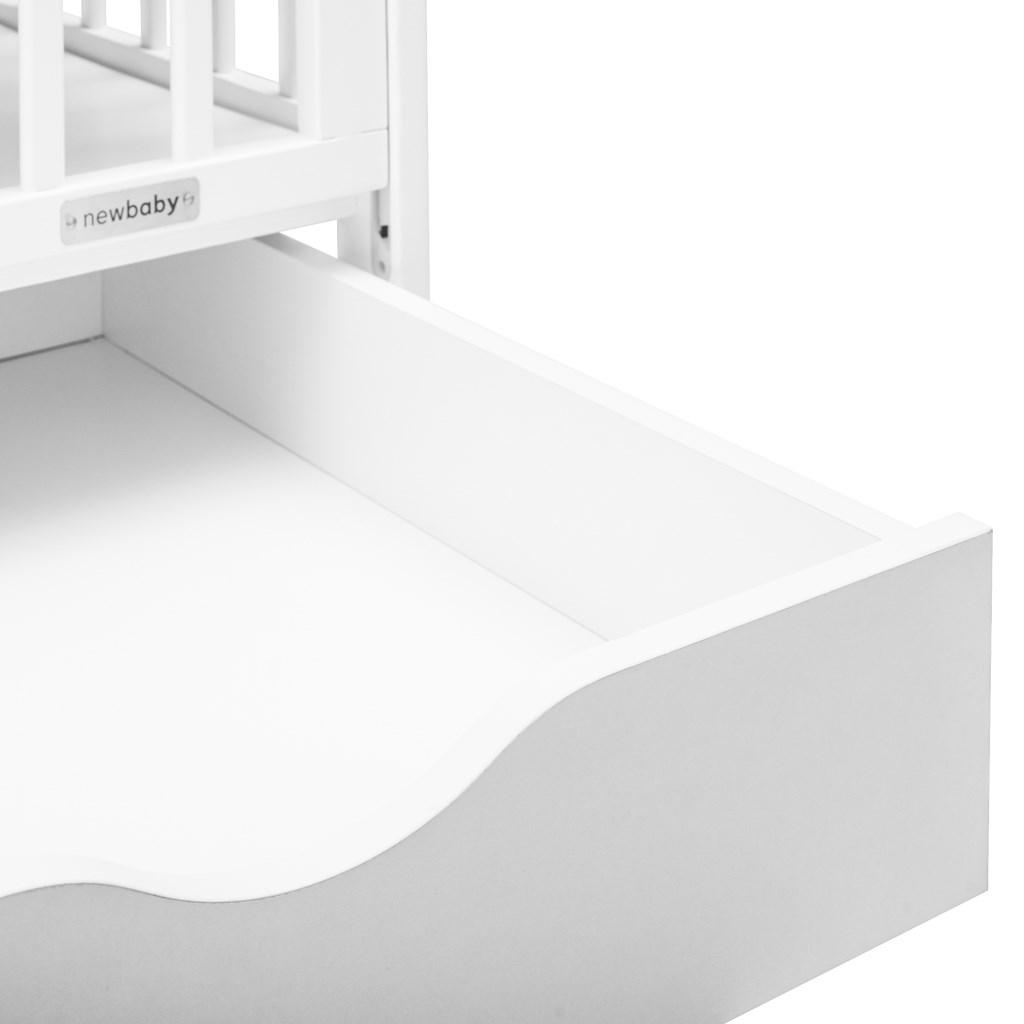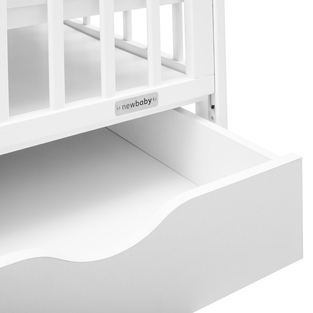La cuna está equipada con un cajón, que está fijado a la cuna con rieles deslizantes, no toca el suelo. Se puede retirar completamente y volver a colocar.