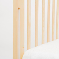 Los laterales de la cuna están hechos de pino 100%. Los barrotes utilizados son de alta calidad y están fijados con un fuerte adhesivo a base de agua.