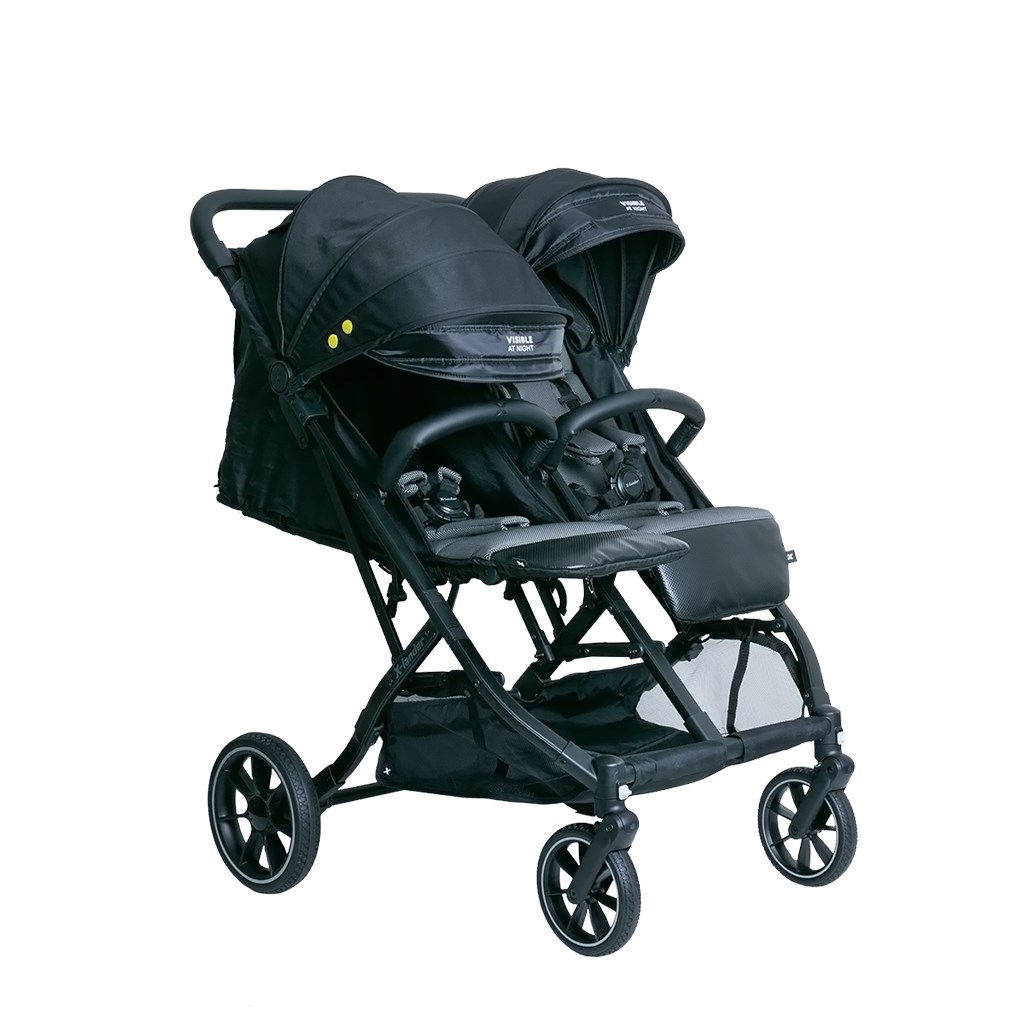 Dobles grandes capotas – ajustables de manera independiente para cada niño, con elementos reflectantes para mejor visibilidad en la oscuridad y un panel ampliable.