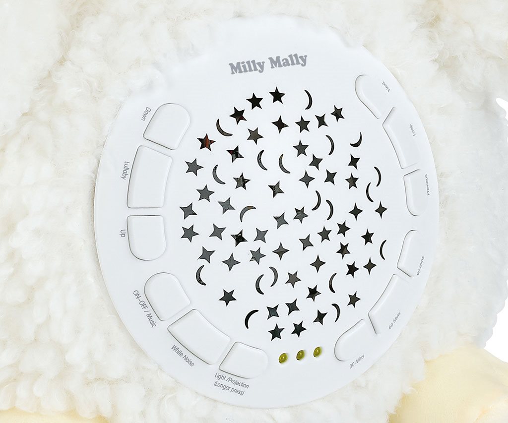 Puede establecer un tiempo de duración adecuado: 30, 60, 90 minutos. Hay 5 niveles de volumen disponibles. Un gran complemento a su función son los 5 tipos de ruido blanco, que tienen un efecto especialmente calmante en el bebé, permitiéndole relajarse y conciliar el sueño más rápido. Con este juguete, escuchará suaves sonidos: el murmullo del agua con cantos de pájaros, el latido del corazón, el goteo del agua, el canto de los pájaros o la lluvia al caer.