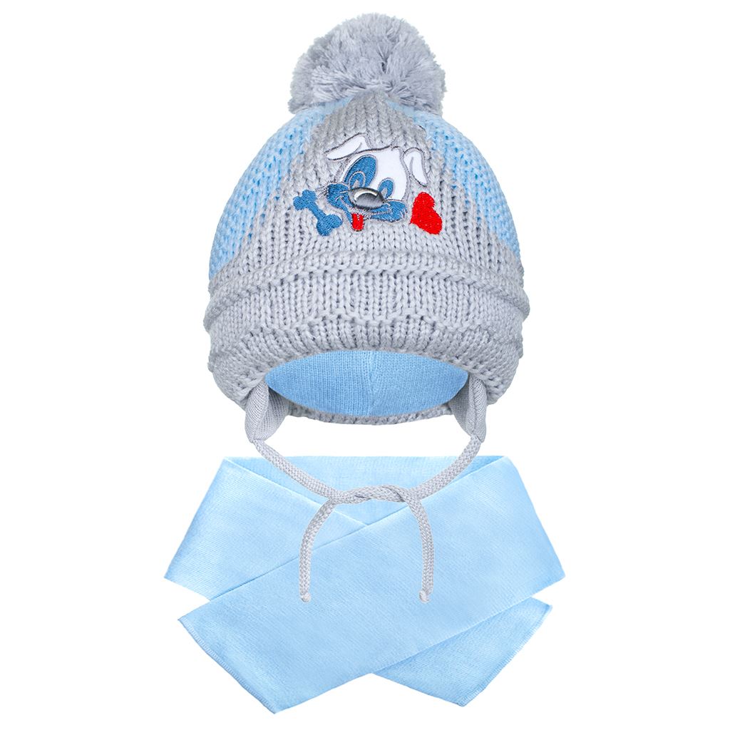 Hermoso gorro de invierno de punto New Baby. El gorro está adornado con una hermosa imagen de un perrito. Tiene cintas para atar, un forro de punto y un adorable pompón. Composición: 100% algodón. Este gorro es adecuado para días de invierno. Ideal para niños pequeños y mayores. El gorro está diseñado para cubrir las orejitas. Circunferencia alrededor de la cabeza: 44-48 cm. Bufanda: tamaño: aproximadamente 96 cm.