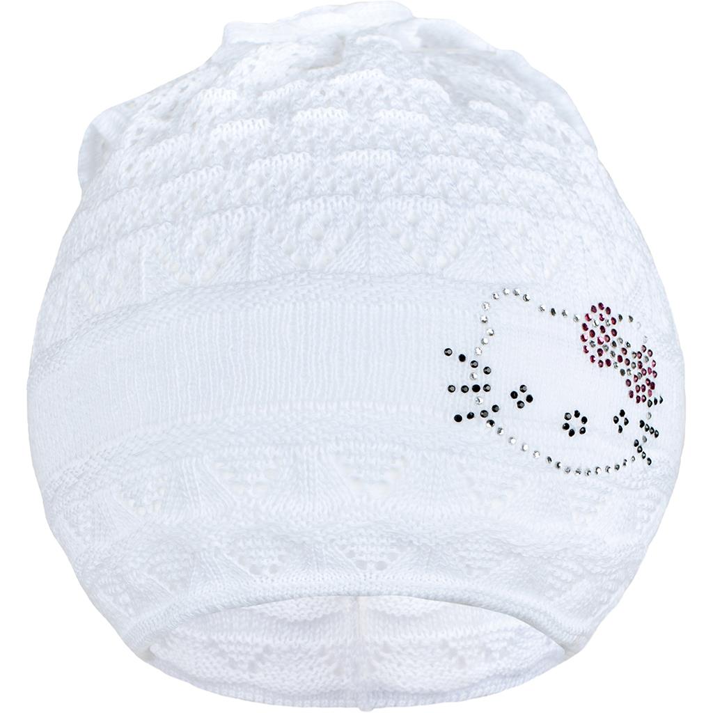 Gorro-pañuelo de primavera New Baby. El gorro está adornado con una imagen de un gatito con piedras brillantes. Está confeccionado con un material transpirable, por lo que es adecuado para los días de primavera y otoño. Ideal para niñas pequeñas y grandes. Composición: 100% algodón. El material es elástico. Circunferencia alrededor de la cabeza aproximadamente 40-50 cm.