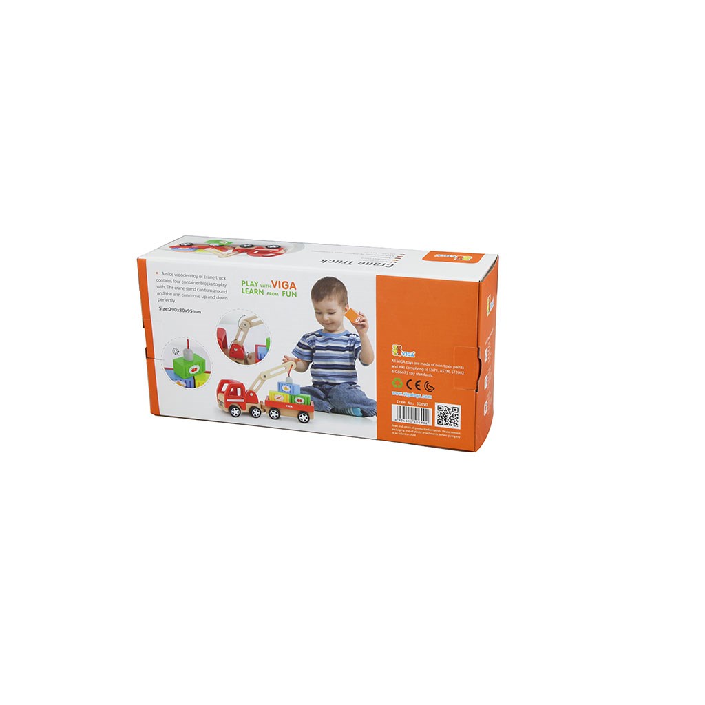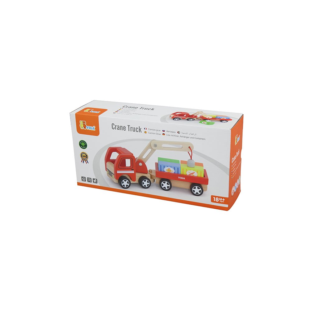 El set está compuesto por un coche con grúa giratoria y imán, un remolque desmontable y cuatro recipientes temáticos (frutas, pan, verduras, pescado) con imanes, que permitirán a su pequeño cargar y descargar los vehículos. Todo el conjunto está hecho de madera de haya pintada con pinturas no tóxicas.