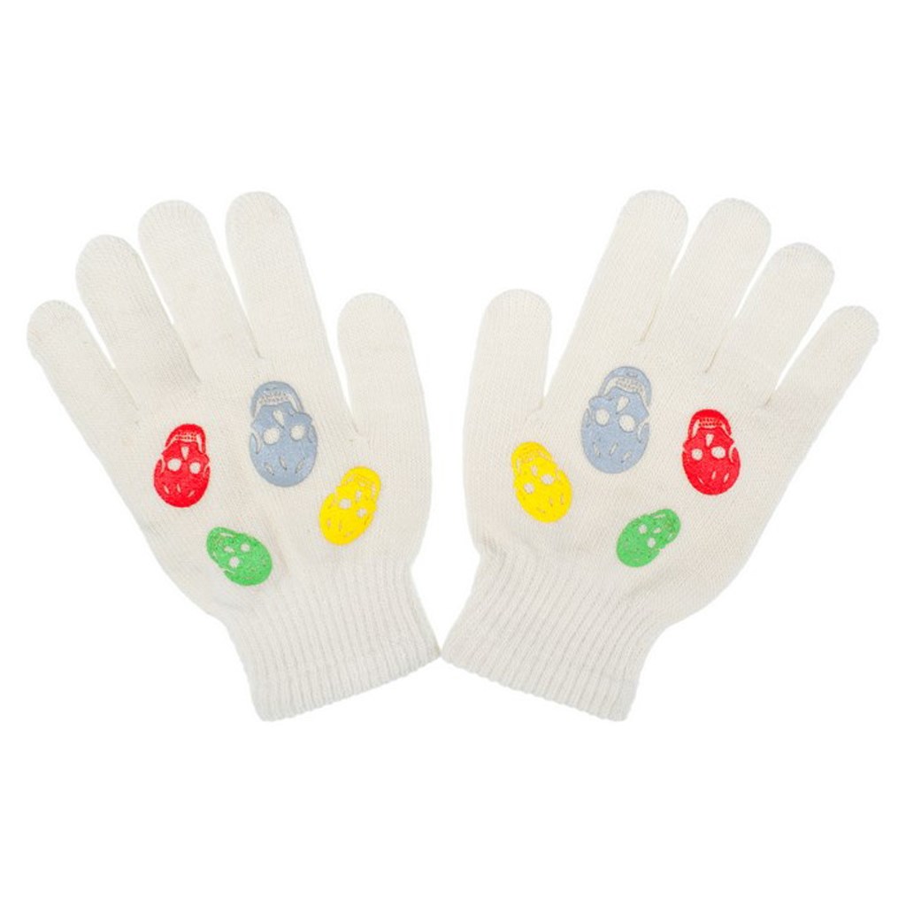 Hermosas manoplas de invierno de punto para bebés New Baby. Las manoplas tienen un puño elástico ajustable. Están decoradas con imágenes de calaveras de colores. La longitud es de aproximadamente 18 cm. Composición: 85% poliéster, 15% elastano.