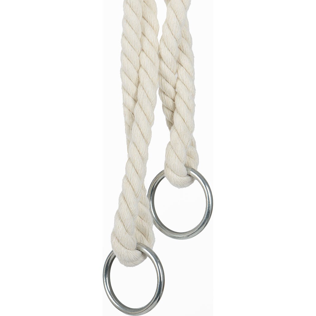 Las gruesas cuerdas de algodón están equipadas con anillos de metal para colgar y terminadas con flecos decorativos.