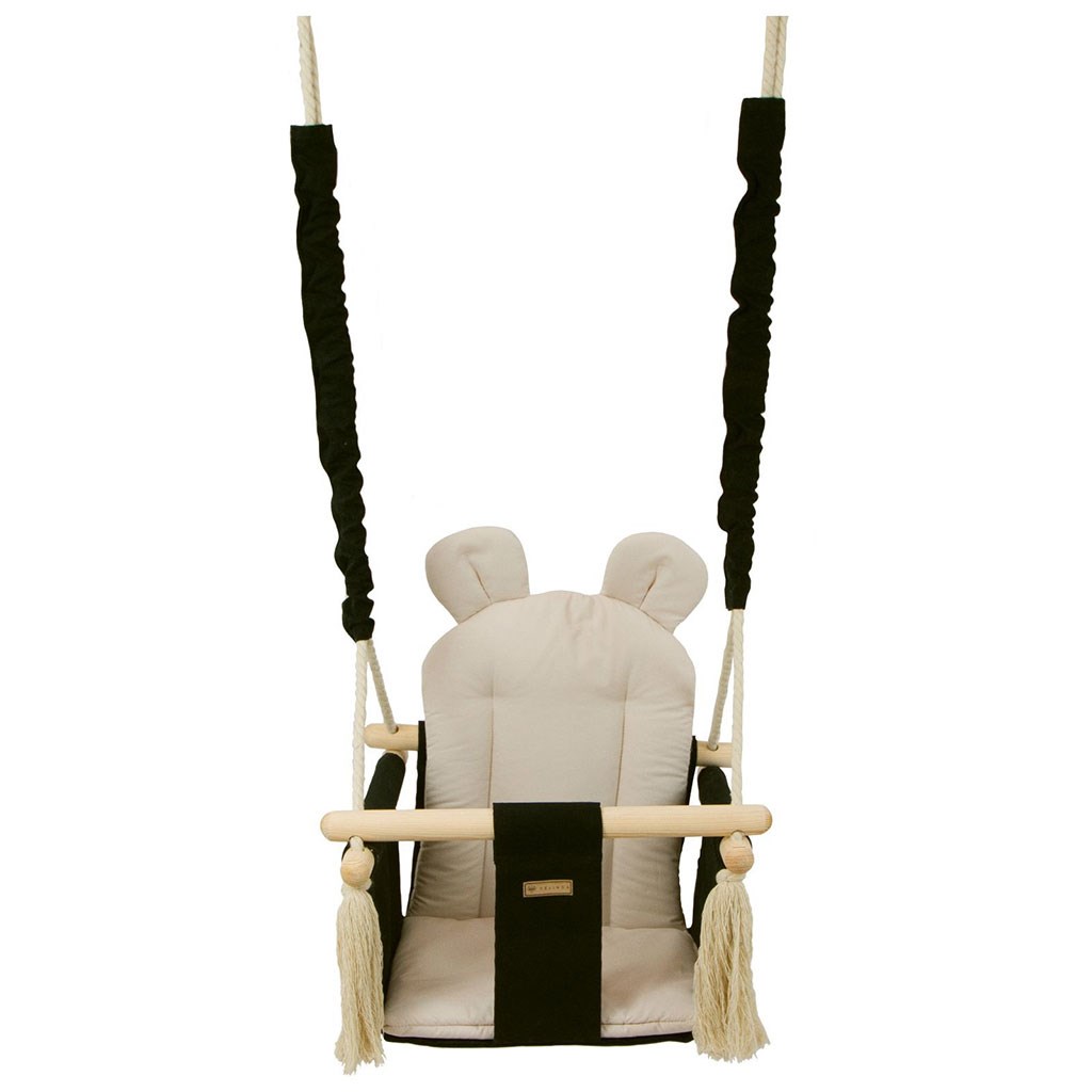 Un elemento adicional de la hamaca son las adorables orejitas y un suave cojín colocado en el asiento, que aumenta la comodidad del niño que juega.