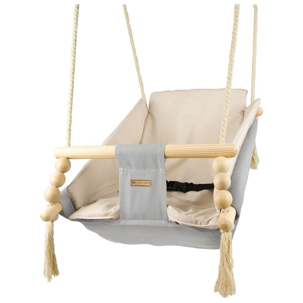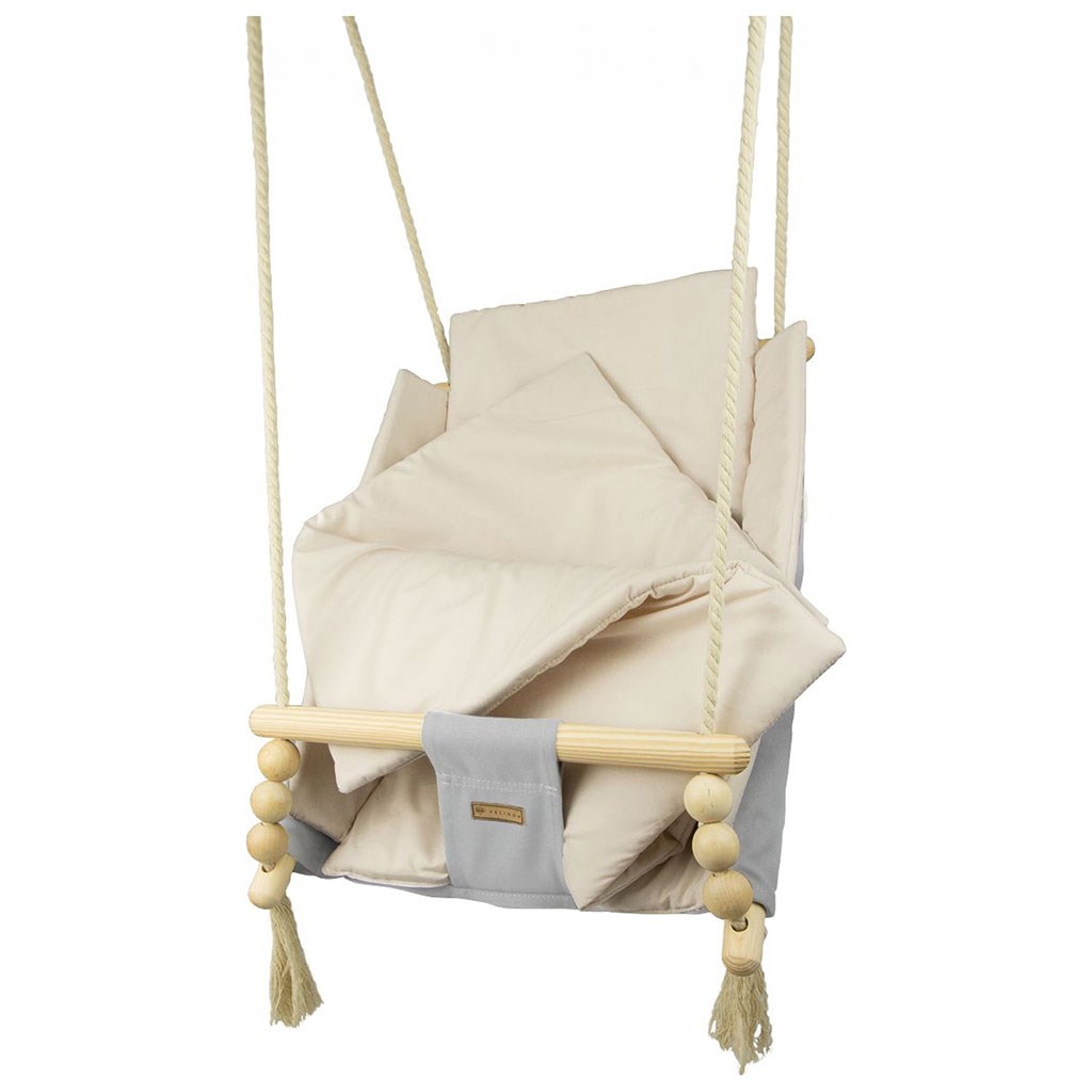 Gracias al uso de algodón agradable al tacto, el niño se siente acogedor, cómodo y seguro. Las fuertes cuerdas de algodón están equipadas con ruedas de metal, lo que permite instalar la hamaca también en la terraza, el porche o el jardín.