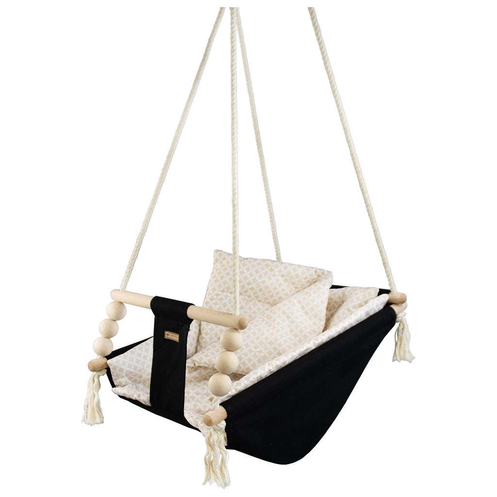 Gracias al uso de algodón agradable al tacto, el niño se siente acogedor, cómodo y seguro. Las fuertes cuerdas de algodón están equipadas con ruedas de metal, lo que permite instalar la hamaca también en la terraza, el porche o el jardín.
