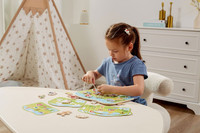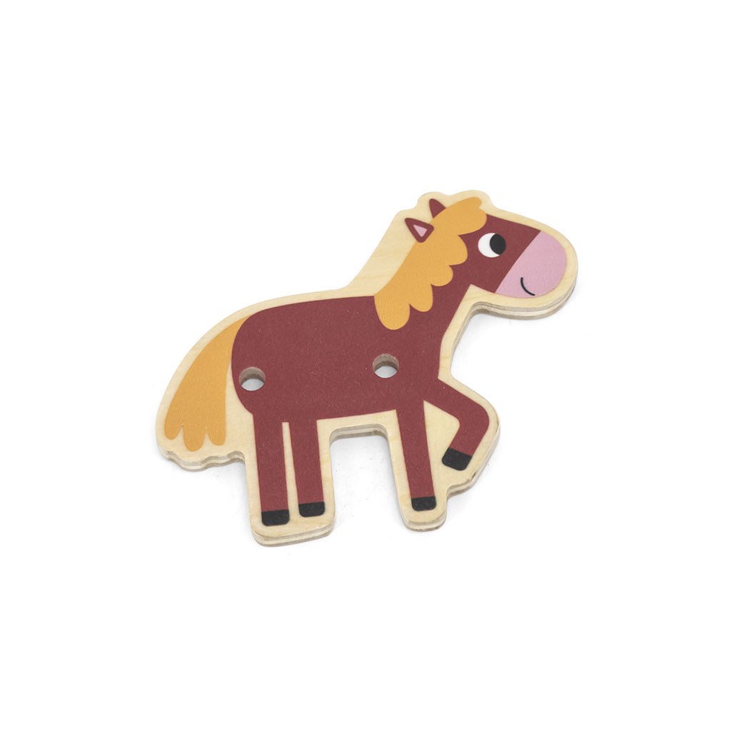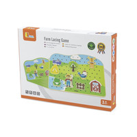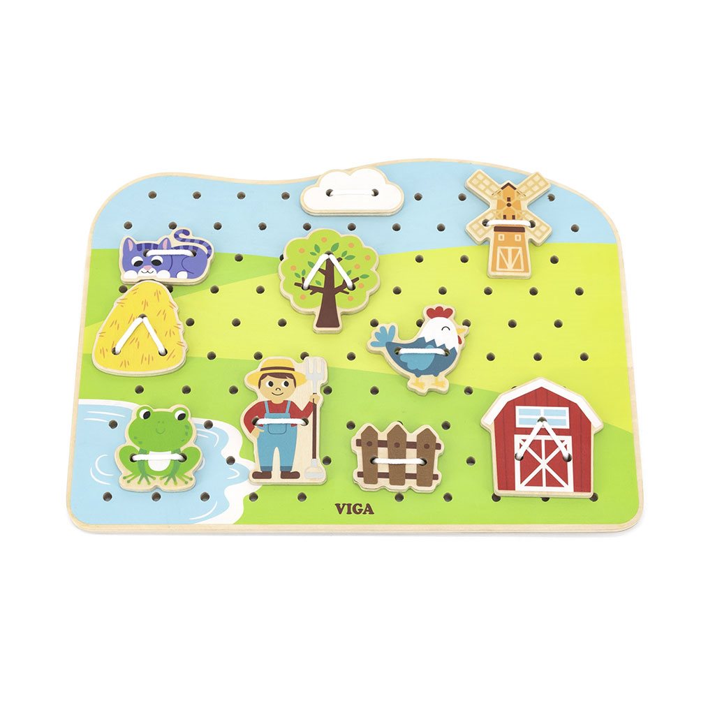 El juego de encadenar - granja de Viga es uno de los juguetes más hermosos, este tipo de juego mejora la coordinación visual y motora así como la orientación espacial. El juego incluye una base de madera con agujeros e ilustración de la granja, 20 bonitas piezas pintadas con representaciones de animales de granja y la naturaleza circundante, y 10 tarjetas que muestran diferentes maneras de ensartar los accesorios en la tabla. El niño asocia y ensarta las piezas según los patrones en las tarjetas, que son colocadas alternativamente en la base. Los pequeños tienen la oportunidad de desarrollar su imaginación y pueden crear su propia narrativa a partir de las piezas disponibles.