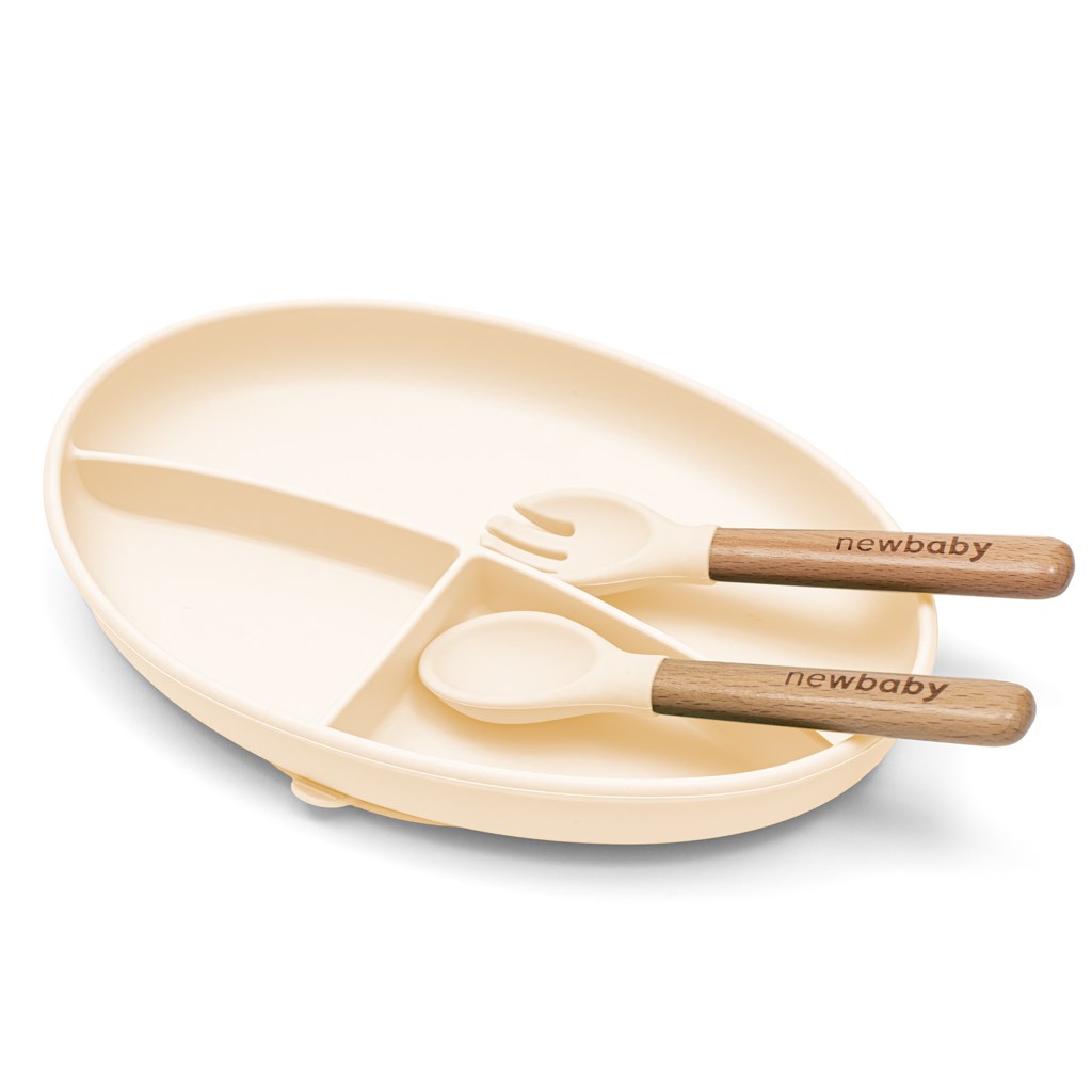 - Una cuchara y un tenedor con mango de madera y un suave grabado del logo New Baby (longitud 14 cm) – agradable al tacto y adaptado a las manos pequeñas.