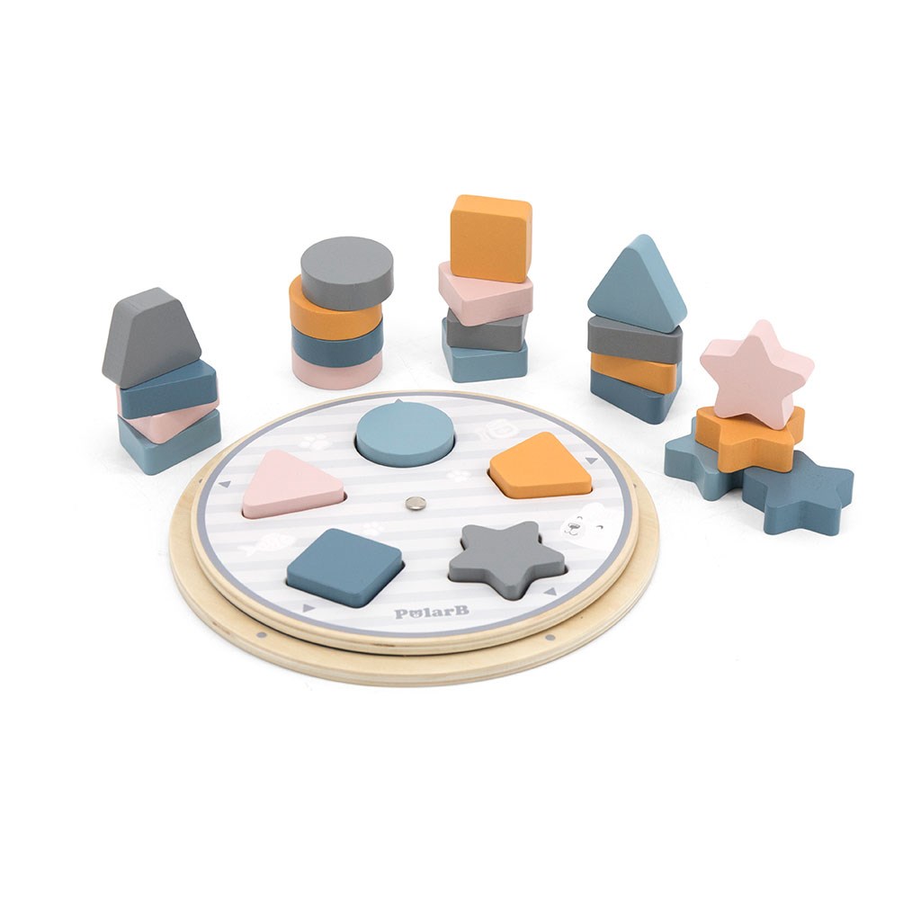 Presentamos el juguete de madera de la compañía VIGA - un insertador de formas y colores de la serie OSO POLAR. El juguete se compone de un disco móvil, 25 bloques en diferentes combinaciones de colores y formas, y tarjetas de doble cara con imágenes. Los bloques se pueden colocar en el disco asignando las formas y colores correctos o sobre las tarjetas organizando las imágenes que se muestran en ellas.