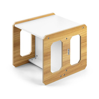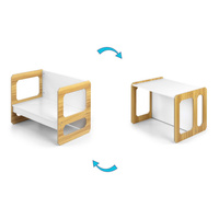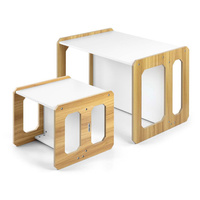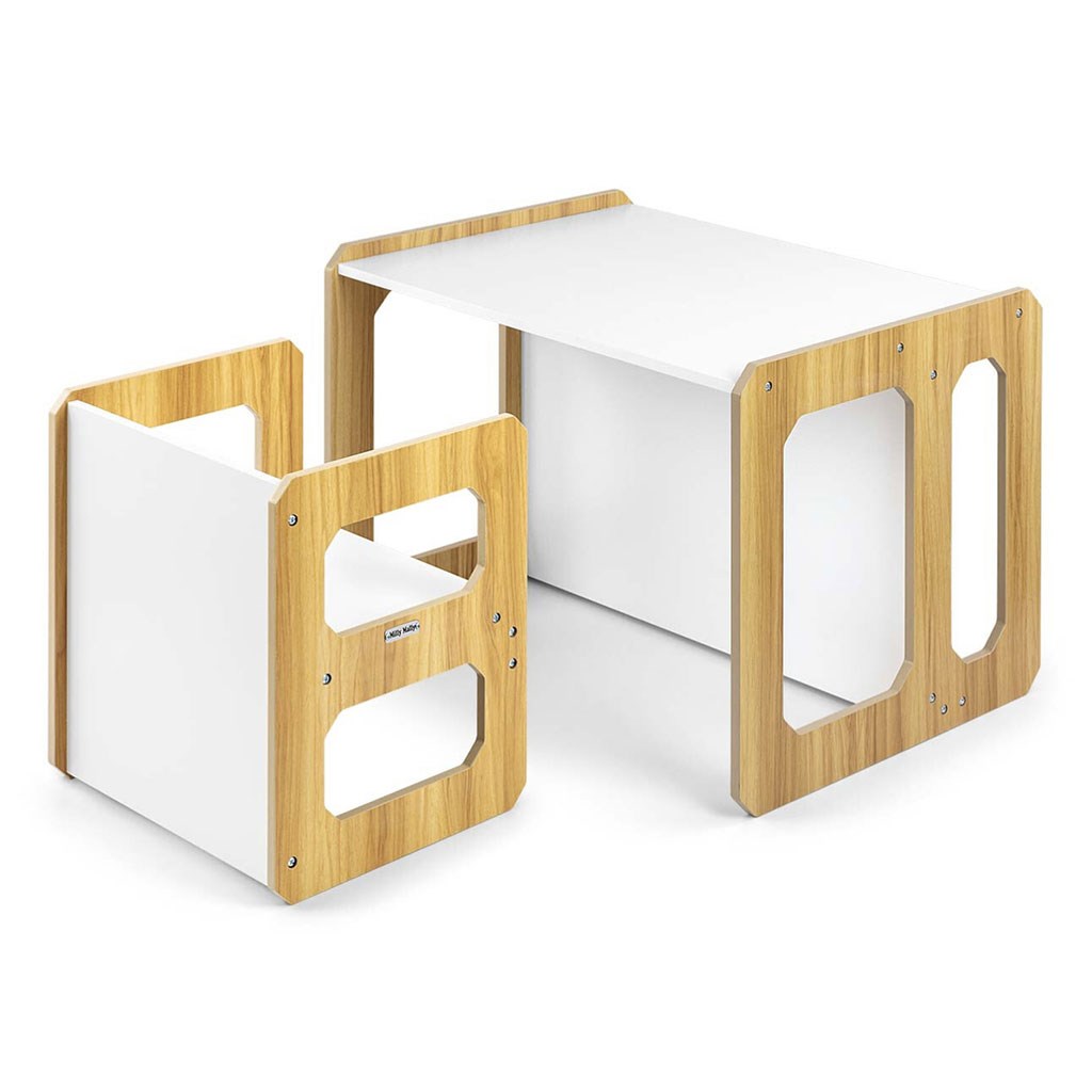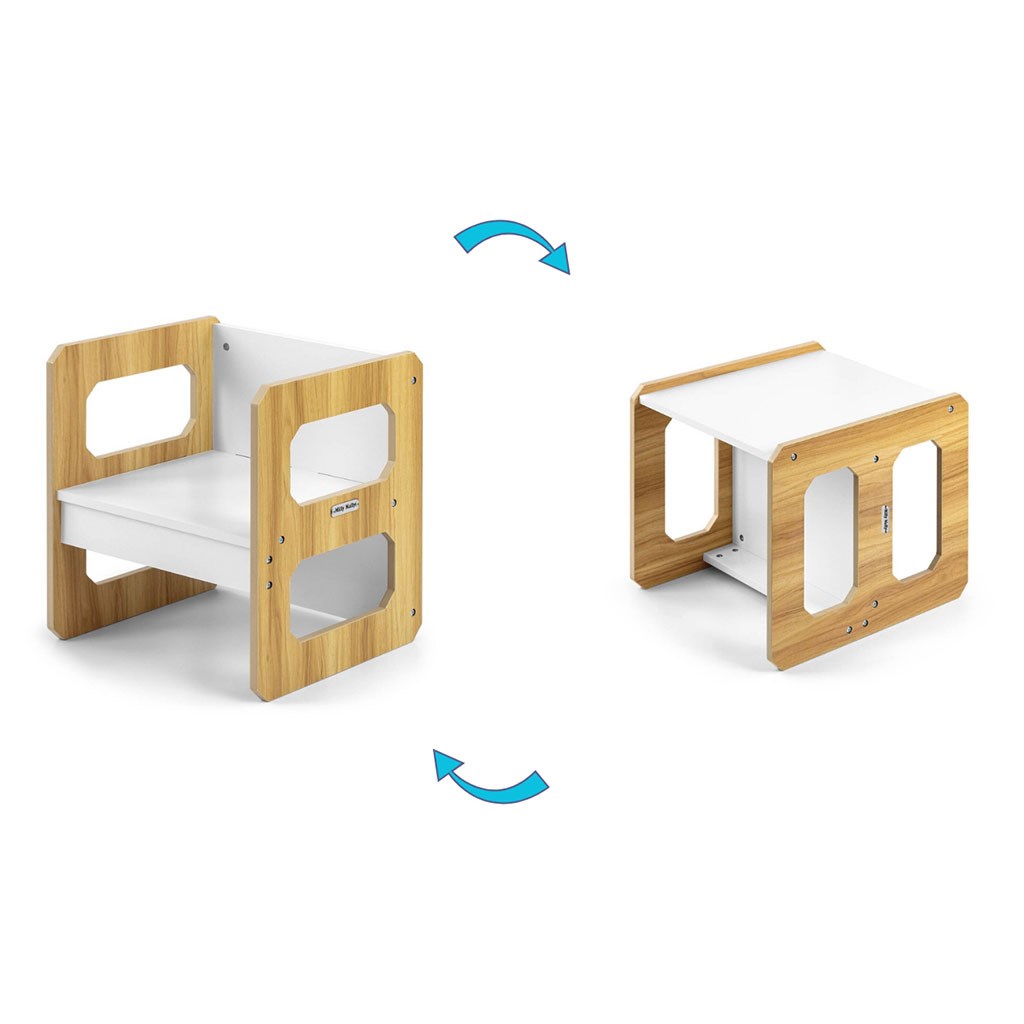El conjunto está compuesto por una mesita y una silla, que gracias a su construcción modular pueden cumplir diferentes funciones: la mesita puede convertirse en un asiento más grande y la silla puede servir perfectamente como una mesita más pequeña o un asiento sin respaldo para un niño mayor. Gracias a su estructura ligera, este mobiliario es fácilmente transportable, lo que permite a los niños adaptarlo a sus necesidades.