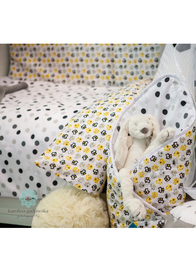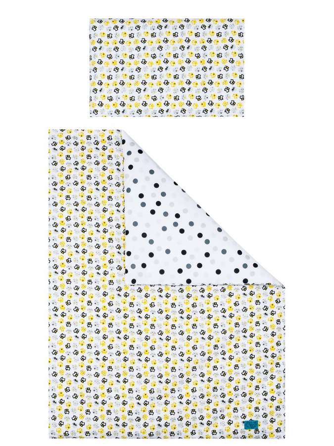 Conjunto de cuna de 5 piezas Belisima Gatitos para bebés, confeccionado en algodón. Un lado está completamente estampado con lunares y el otro lado presenta dibujos de gatitos. Está fabricado con un material suave y agradable al tacto. El conjunto incluye funda de almohada de aproximadamente 40x60 cm, funda de edredón de aproximadamente 100x135 cm, protector de cuna de aproximadamente 180 cm, y relleno para la almohada y el edredón. Material 100% algodón.