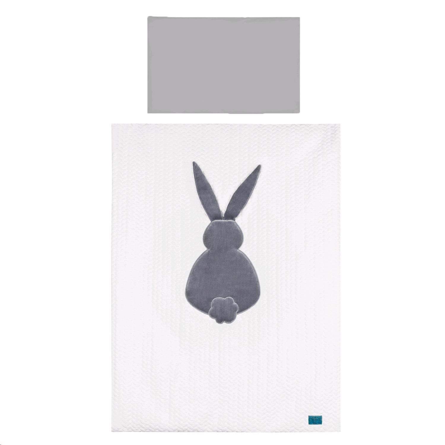 Conjunto de cuna de 3 piezas Belisima Conejito. El conjunto está fabricado de un lado con material de punto adornado con un patrón en 3D y un adorable conejito de peluche. El otro lado es de algodón. Está hecho de un material suave y agradable al tacto. Contiene funda de almohada de aproximadamente 40x60 cm, funda de edredón de aproximadamente 100x135 cm y un ochranný mantinel de aproximadamente 31x175 cm. Composición: lado superior de punto: 50% algodón, 50% poliéster. Lado inferior: 100% algodón.