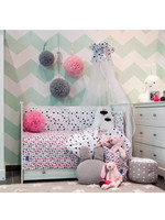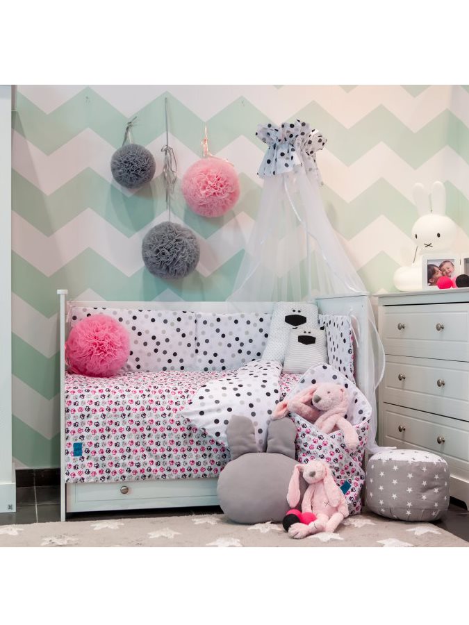 Conjunto de cuna infantil de algodón de 6 piezas Belisima Gatitos para bebés. El conjunto tiene un lado completamente impreso con puntos y el otro lado está íntegramente decorado con imágenes de gatitos. Está fabricado con un material suave y agradable al tacto. El conjunto incluye fundas para cojín de aproximadamente 40x60 cm, funda para edredón de aproximadamente 100x135 cm, un protector de cuna de 180 cm y el relleno: un cojín, un edredón y un dosel. Dosel: 150x200 cm. Material 100% algodón.