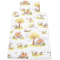 Hermoso set reversible New Baby Animales en el Bosque para el carrito. El set está fabricado con dos tipos de telas. Un material de algodón con un bonito motivo infantil por un lado y un material de terciopelo por el otro. El terciopelo es muy agradable y suave al tacto, y mantiene su forma original durante mucho tiempo. Es ideal tanto para bebés desde el nacimiento como para niños más grandes, ya sea como manta para jugar, para el carrito o al aire libre. El set incluye un cojín y una manta. Nos enfocamos en la calidad, por lo que el set de terciopelo está confeccionado con un material de alta calidad que no destiñe y no provoca reacciones alérgicas. Es suave al tacto, cálido, acogedor, único y muy diferente a los demás. Todo está relleno con fibra antialérgica. Composición: por un lado 100% algodón impreso con un hermoso diseño infantil, el otro lado es tela de terciopelo - 100% poliéster, relleno 100% fibra antialérgica. El material cumple con la norma Oeko-Tex Standard 100. Dimensiones: cojín: aprox. 30x25 cm, manta: aprox. 75x50 cm. Estos productos son seguros porque: