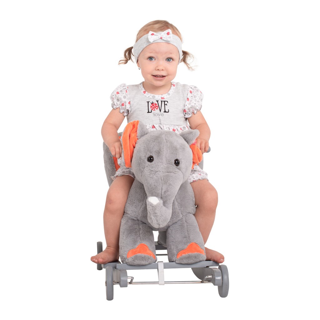 Un extraordinariamente bonito elefante balancín con ruedas de PlayTo ha sido diseñado para los niños que aman la aventura. El asiento cómodo y ergonómicamente diseñado con respaldo brindará a su hijo comodidad y seguridad durante el divertido balanceo. Los travesaños de madera resistentes y los manillares ayudan al niño a mantener el equilibrio. Además, las barras de balanceo se pueden desmontar fácilmente. Con un simple mecanismo en las barras, puedes sacar las ruedas, transformando instantáneamente el juguete de balanceo en un elefante de montar. Todo el juguete está hecho de un material suave y muy agradable al tacto. Al presionar la oreja, el elefante canta una alegre melodía. Las pilas ya están incluidas en el elefante. Este juguete ayuda a los niños a desarrollar la coordinación de movimientos y estimula su imaginación.