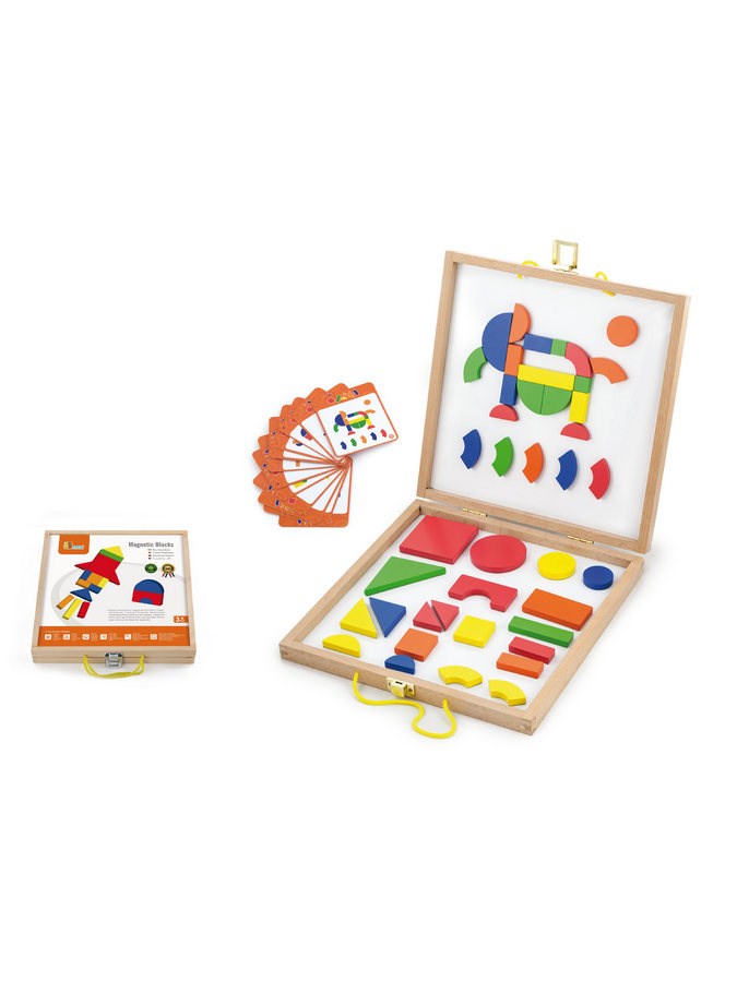 Maleta de madera con bloques magnéticos Viga. La maleta de madera contiene 42 bloques y 12 tarjetas con 24 combinaciones en las que se pueden colocar los bloques. El niño puede crear basándose en una plantilla o inventar sus propias combinaciones. Todos están fabricados con materiales de alta calidad. Los bloques magnéticos y coloridos vienen en diversas formas, lo que permite al niño crear nuevas figuras. Al jugar con los imanes, el niño aprenderá las reglas de su funcionamiento y entrará en un mundo de nuevas aventuras. Despierta la curiosidad y la creatividad. Este fantástico juguete funciona como una herramienta didáctica. El juguete ayuda a mejorar la destreza manual y la agilidad, enseña al niño a reconocer formas y colores, y fomenta y desarrolla el sentido de observación. El juguete está hecho de madera lacada. Nuestra prioridad es la seguridad y la calidad de nuestros productos, por lo que los colores utilizados en los juguetes no son tóxicos y cumplen con las normas de seguridad (EN71 y ASTM). Para niños a partir de 36 meses. El juguete es adecuado como un hermoso regalo que sus hijos adorarán.