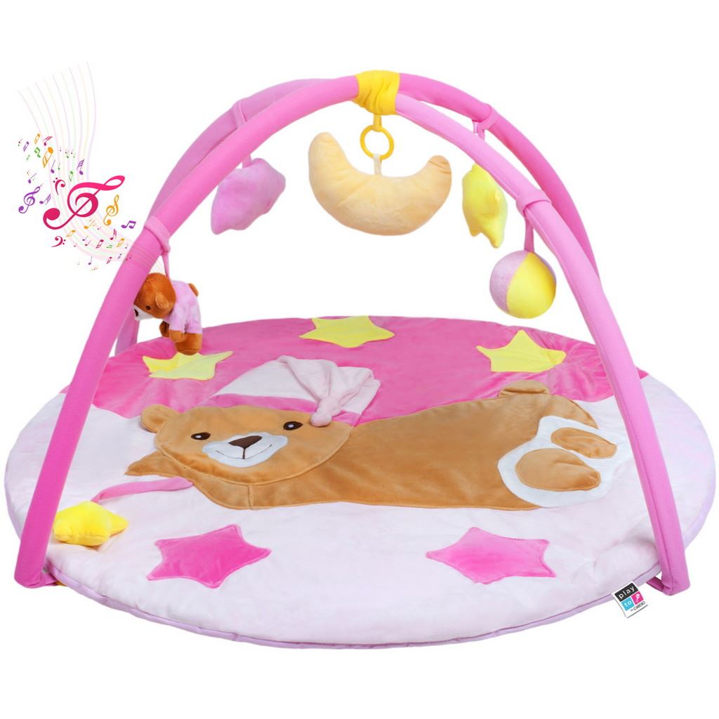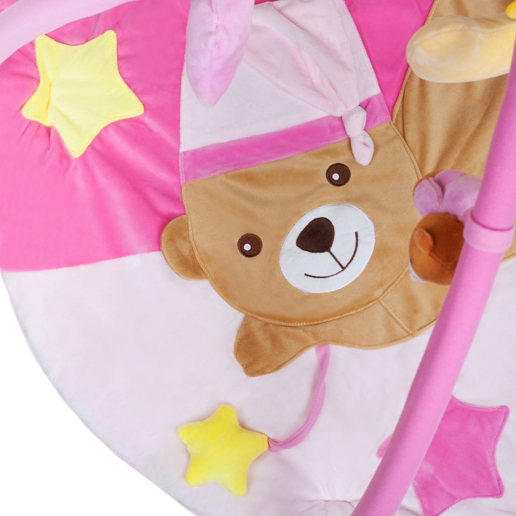 Bonita y original alfombrilla de juego educativa con melodía PlayTo, diseñada con arco para estimular la imaginación de los niños a través del reconocimiento de colores y formas. La alfombrilla de juego presenta un hermoso color brillante con un motivo de osito. Desarrolla los sentidos del tacto, la vista y el oído gracias a sus partes crujientes y móviles. Suave y agradable al tacto, permite que el bebé se acueste cómodamente boca abajo o de espaldas, ofreciendo libertad de movimiento. El bebé puede tener así un espacio seguro y acogedor, lo que lo motiva a levantarse. Los juguetes se pueden quitar fácilmente del arco. Cada bebé encontrará su juguete favorito en la alfombrilla, que incluye un espejo, partes crujientes, un peluche con sonajero, y un peluche con campanilla. En la luna hay un módulo de sonido que, al presionarlo, reproduce melodías. Se puede usar tanto en casa como al aire libre. Gracias a su estructura simple y la bolsa incluida, la alfombrilla se puede transportar fácilmente. Los juguetes se pueden desmontar y usar de forma independiente. Proporcione a su bebé un lugar mágico para jugar y descansar. Para PlayTo, su satisfacción y la comodidad de su bebé son importantes. Por eso le ofrecemos esta adorable, cómoda, colorida y muy suave alfombrilla de juego. La alfombrilla es esponjosa y de suave gamuza, proporcionando el máximo confort al bebé. Si no está usando la alfombrilla, se puede plegar fácilmente para protegerla del polvo o daños. Puede desplegarla nuevamente en cuestión de minutos.