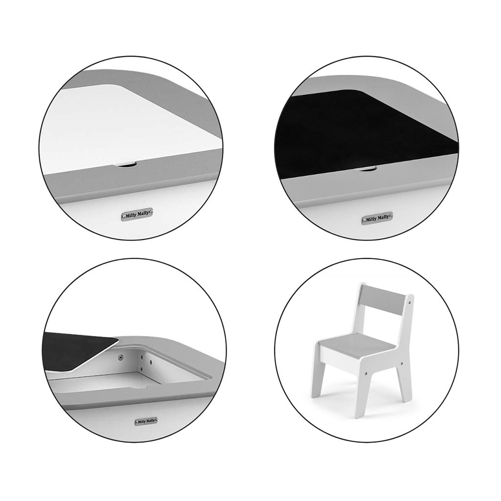 El conjunto Olaf se caracteriza por su exclusiva superficie – un lado de la mesa es blanco, mientras que el otro es liso y pintado con pintura de pizarra, lo que es ideal para dibujar, escribir u otras actividades artísticas. La superficie es extraíble y debajo de ella hay un espacioso espacio de almacenamiento, que facilita el almacenamiento de juguetes, bloques o material artístico, haciendo que mantener el orden sea más sencillo.