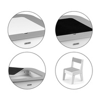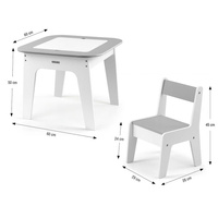 Las sillas son ligeras, lo que permite a los niños moverlas fácilmente, y su construcción estable junto con bordes redondeados garantiza un uso seguro. Los muebles están fabricados con un tablero MDF de alta calidad, lo que los hace duraderos, fáciles de limpiar y de montar. El paquete contiene todos los elementos necesarios para un montaje rápido y sencillo.